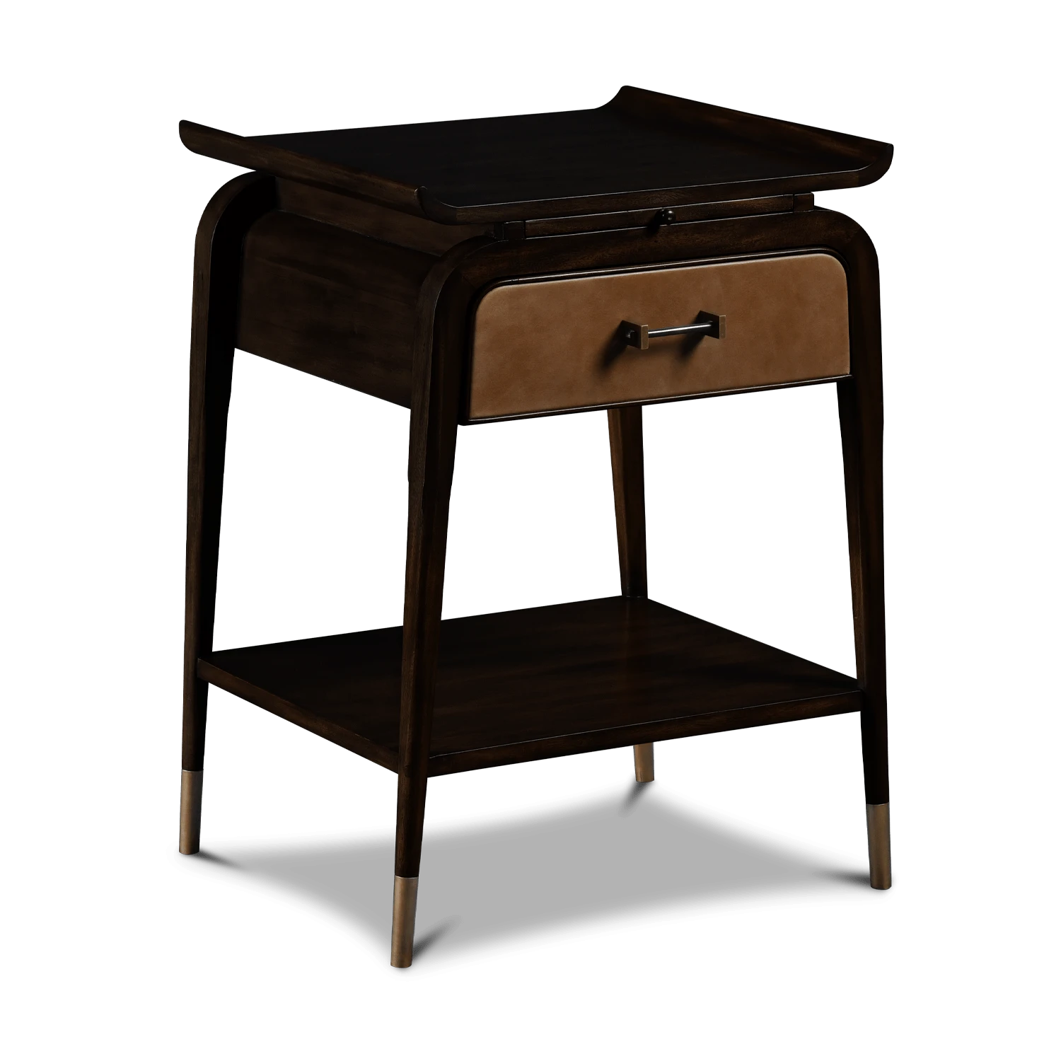 This night stand is inspired on the French 50โ€™s with a hint of oriental influences. Its top has upwardly curved ends, a retractable table, leather covered drawer and finely pointed legs with brass caps. It also has a wide lower shelf, making this piece as useful as it is spectacular.