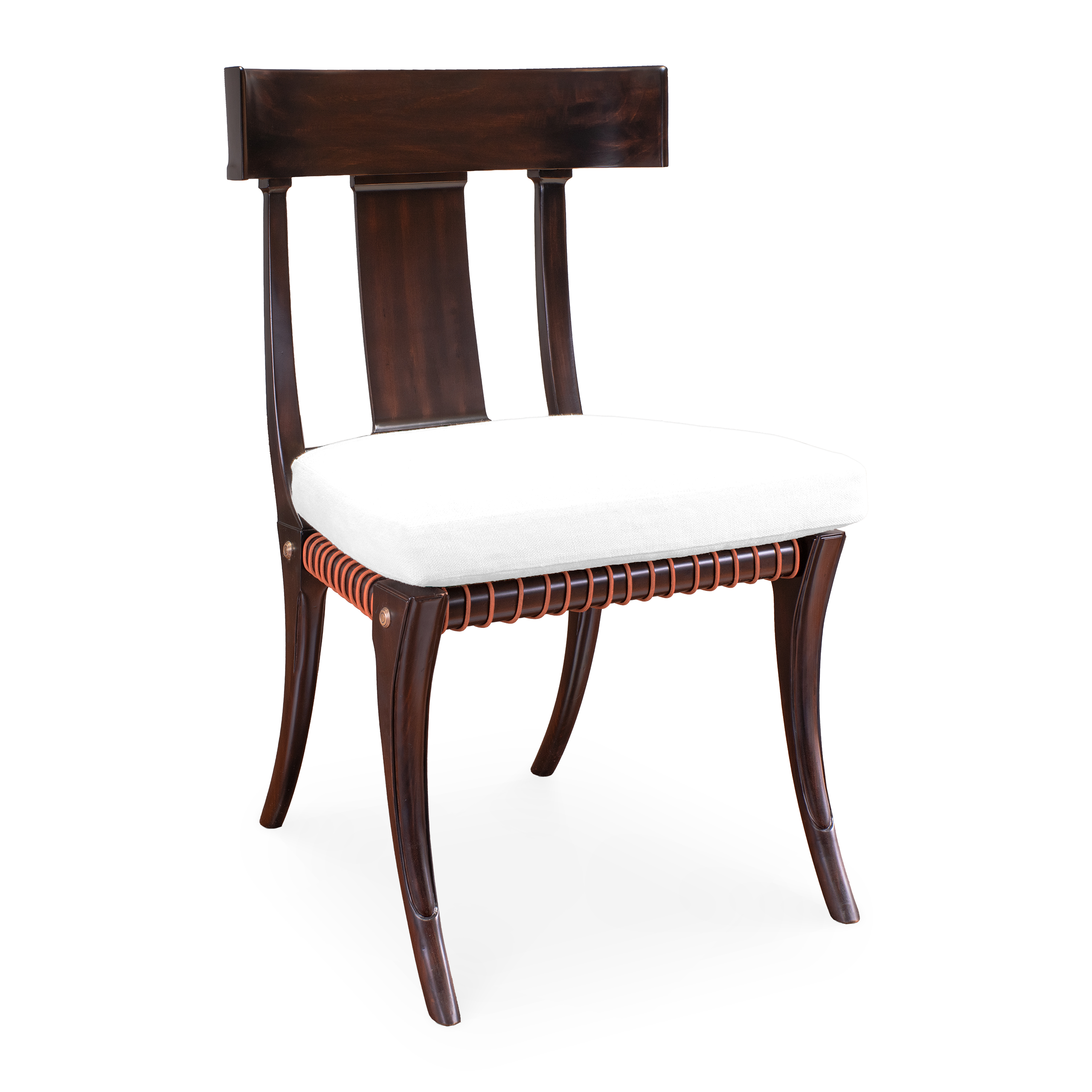The Delos Chair is a refined take on the classic Klismos chair, blending historical inspiration with contemporary craftsmanship. Its elegantly cur¬ved legs and slightly reclined backrest provide both visual harmony and ergonomic comfort. A defining feature of this chair is its leather-woven seat, which enhan¬ces texture and artisanal quality while ensuring durability. Subtle brass details add a touch of sophistication without overpowering the design, highlighting its meticulous construction.