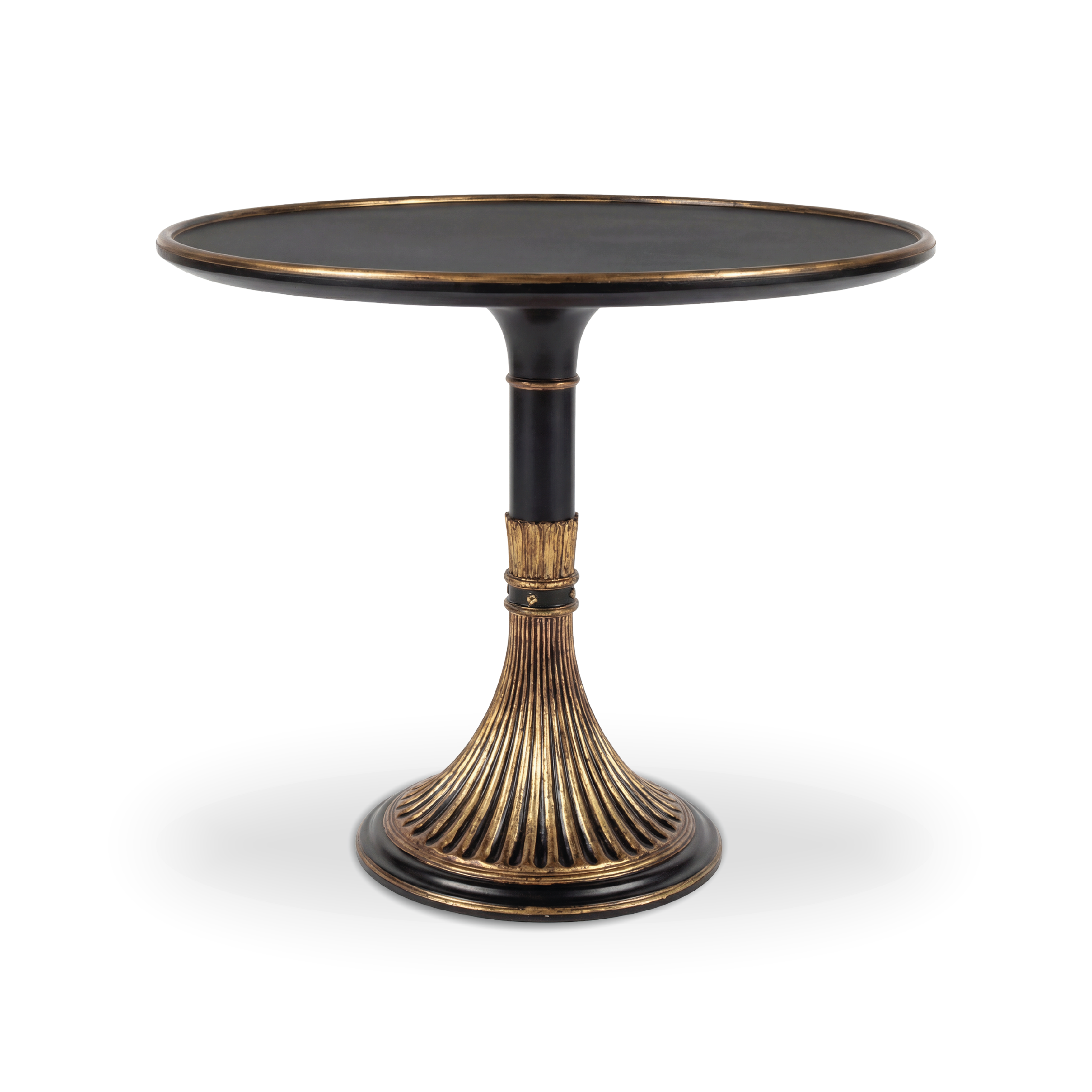 Inspired by the forms of classical antiquity, the Delphi lamp table draws from the structure of fluted columns and pedestals found in Greek and Roman architecture. Its base, opening subtly toward the ground, reflects these references through a restrained and well-proportioned interpretation. The circular top rests on a central shaft that defines the piece with clarity, maintaining a stable and balanced silhouette. The black finish establishes a quiet presence, while gold leaf highlights the texture of the base and emphasizes its sculptural character. The Delphi lamp table translates classical tradition into a precise and timeless language.