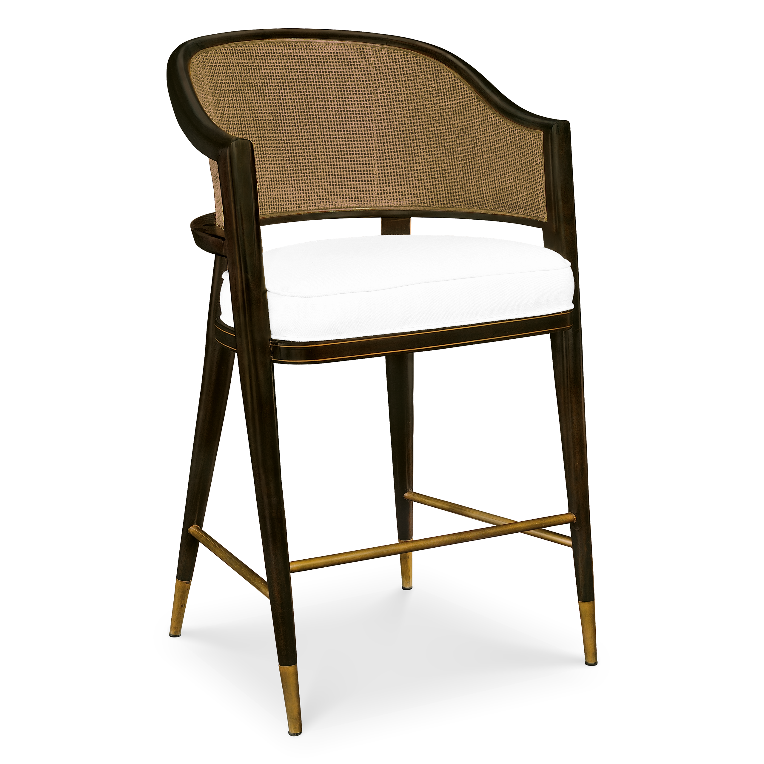 The grasse bar stool counter height is a sophisticated embodiment of French 50’s design, seamlessly blending elegance with functionality. Its sleek black frame supports a distinctive cane backrest, offering both aesthetic appeal and comfort. Adding to its charm are two delicate brass tubes at the back, which not only provide structural support but also introduce a touch of opulence. The centerpiece that holds the backrest is adorned with hand-painted linear decorations on its sides, showcasing meticulous craftsmanship. The chair’s apron, which supports the seating upholstery, is further enhanced with hand-painted golden details, adding a layer of luxury. Drawing inspiration from renowned designers of the era, this chair captures the innovative spirit and refined aesthetics of mid-century France.