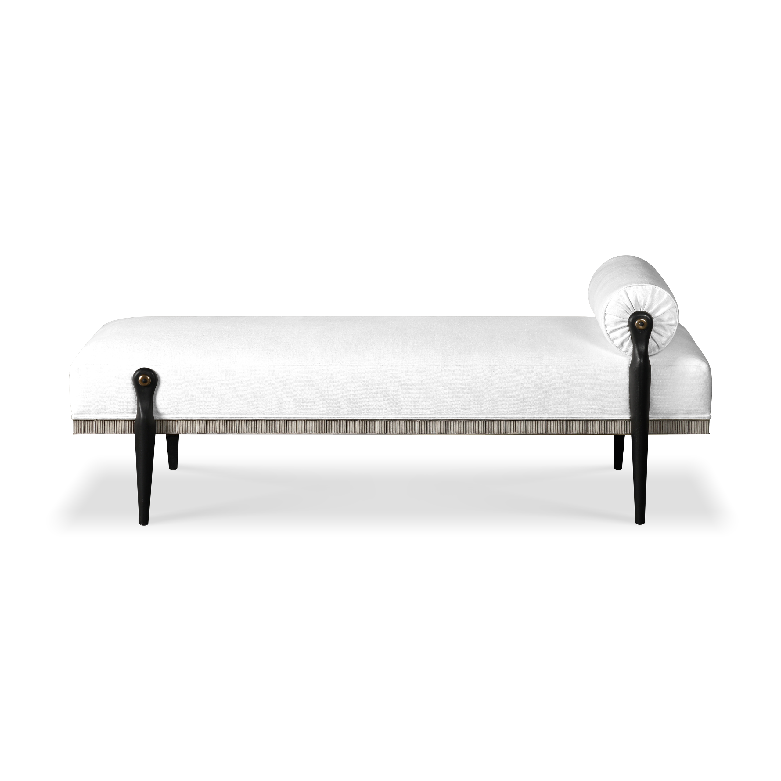 Primavera wood and iron base. Webbing seat upholstered with foam, fiber and down. Roller cushion with foam, fiber and down..