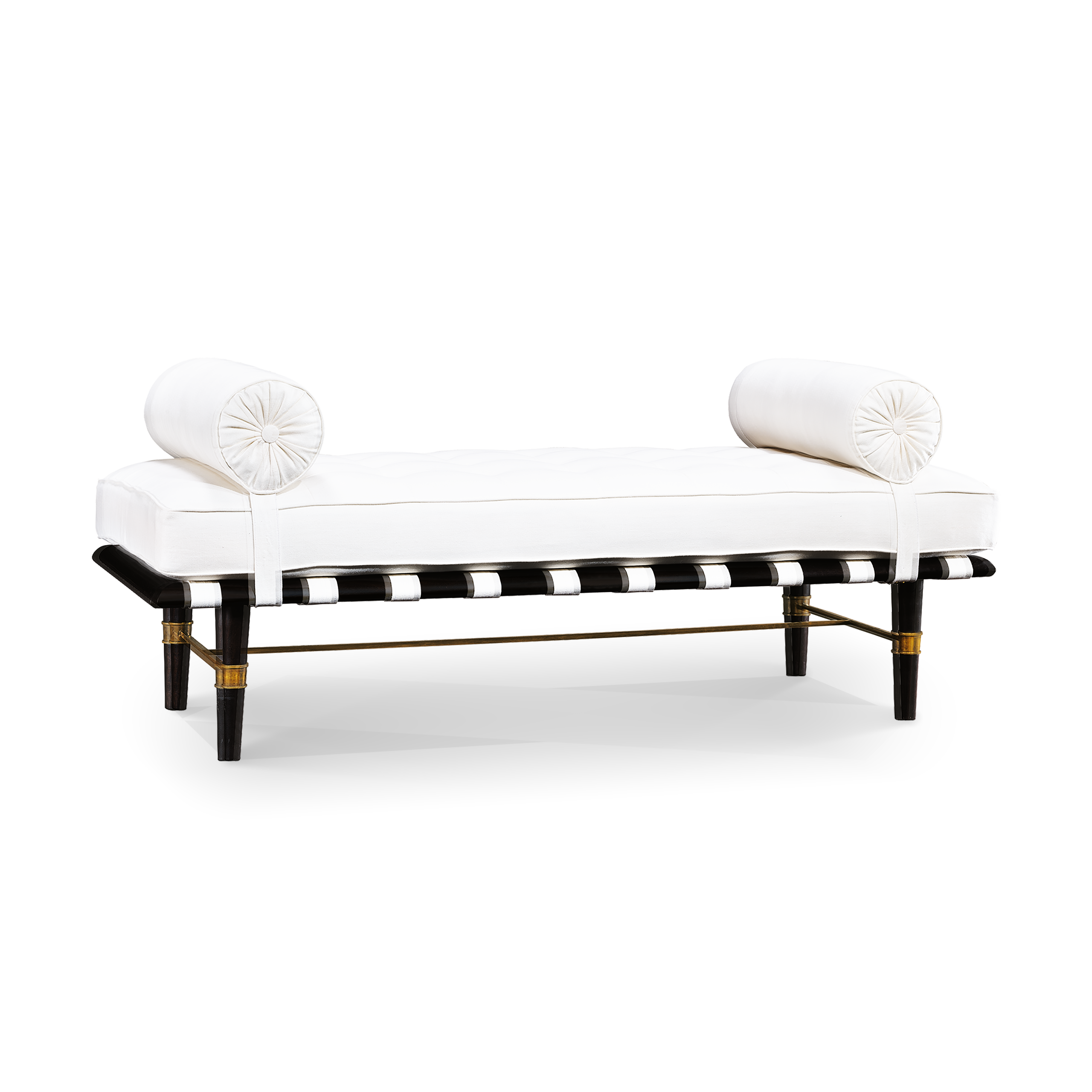 This is a Mid-Century Modern inspired bench from 1960-1969 with a tufted seat and an upholstered roller on each side, tapered legs and antiqued brass detailing.