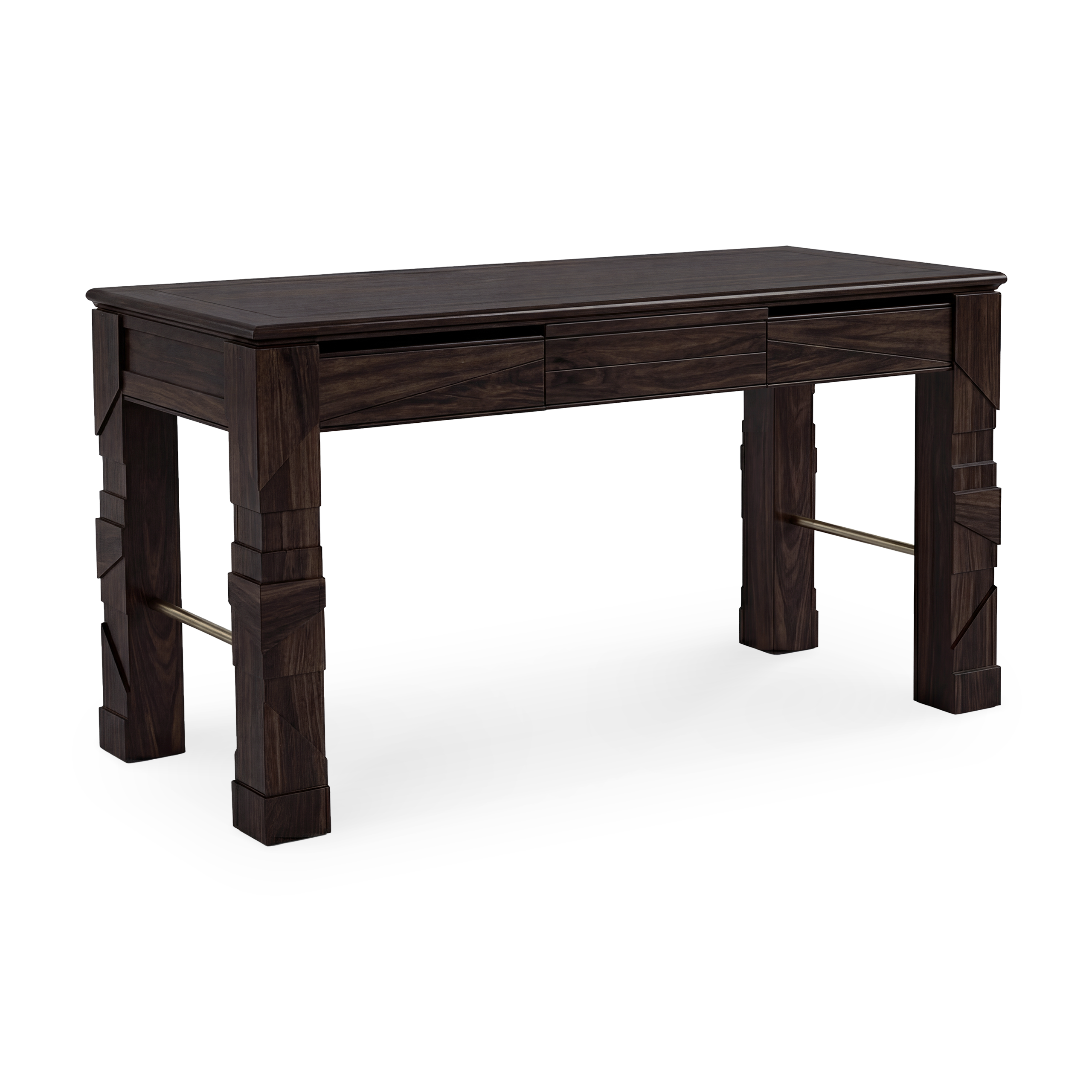 Inspired by the structural clarity of Chinese furniture, the Levigne console draws from its horizontal logic and restrained proportions through a contemporary interpretation. The movement of the piece is concentrated in the legs and stretcher, where shifting planes create a continuous rhythm that adds depth and character without disrupting the clarity of the form. The primavera veneer, finished in an ebonized tone, enhances the natural grain of the wood, while the brass stretchers introduce a precise contrast within the structure. The Levigne console is a well-contained piece, with movement and a clear presence.