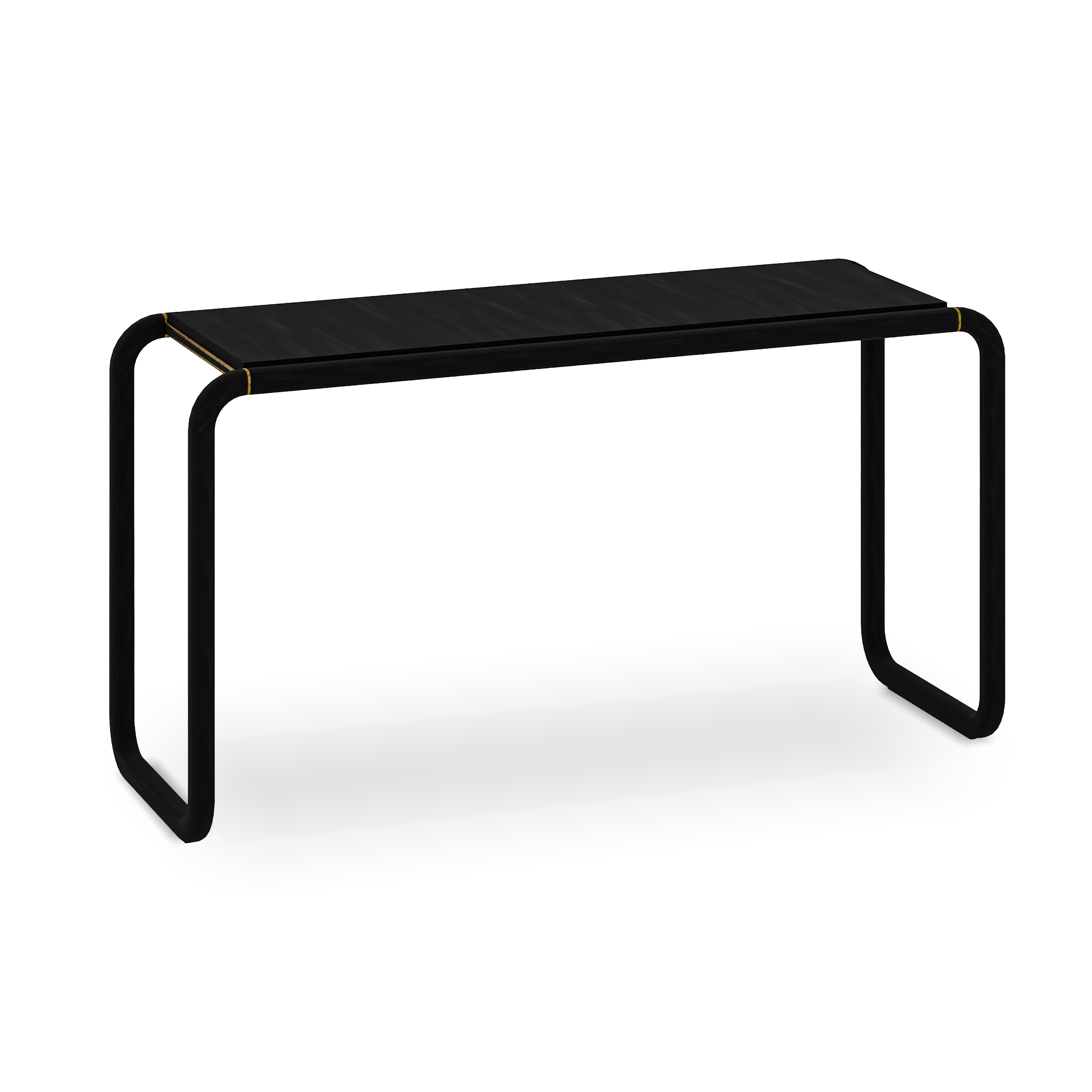 The Marceau Console stands out for the purity of its lines and the harmony of its proportions. Its ebony top, smooth and refined, rests on curved bases joined by a brass ring that accentuates the meeting of materials. Along the edge of the top, a fine brass inlay traces the contour, adding a subtle touch of contrast. A contemporary, understated piece that celebrates precision and quiet elegance.