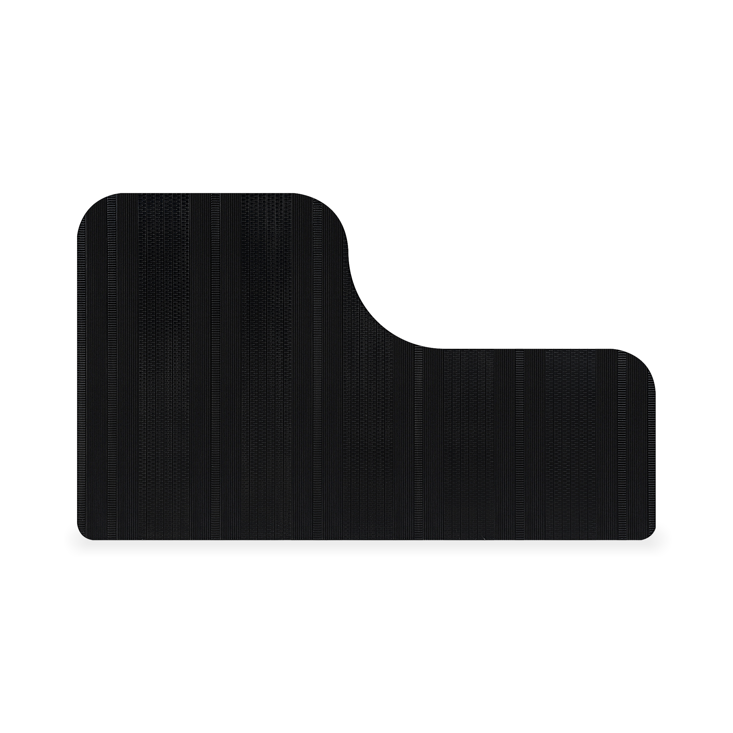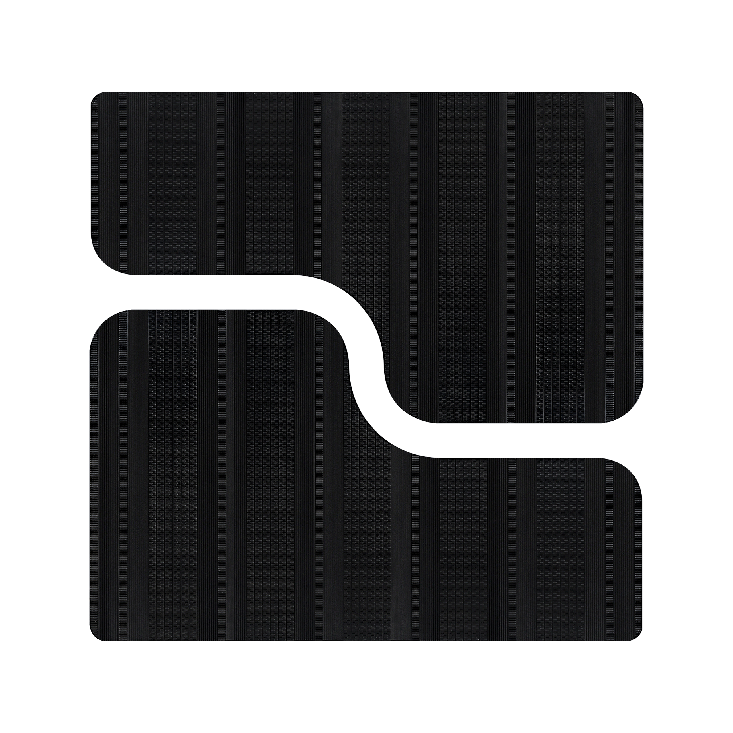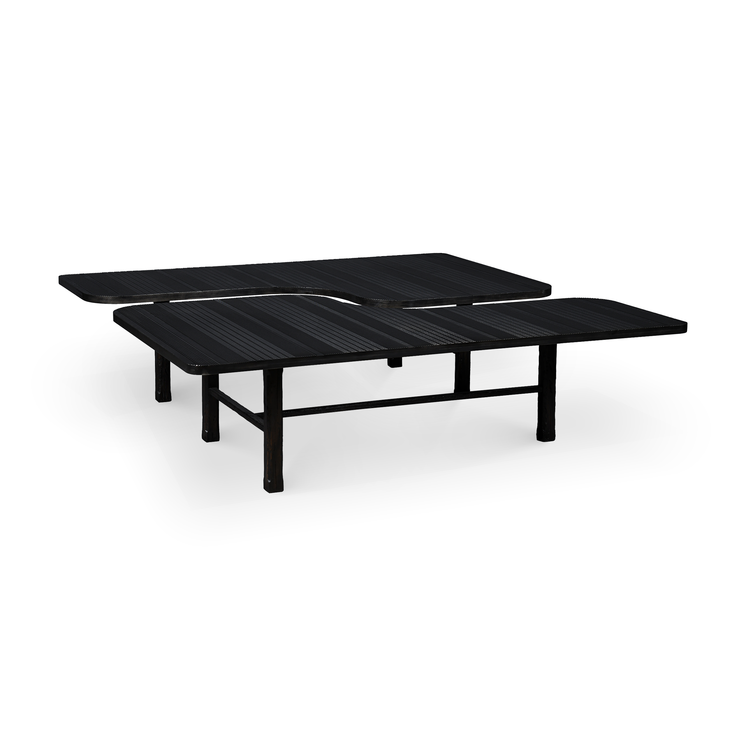 When separate, these cocktail tables have an irregular shape, but when joined they form a perfect square. The tabletops are made of dark metal with decorative lined patterns that run across its surface. The lines range in size, length and width, creating a textured effect.
