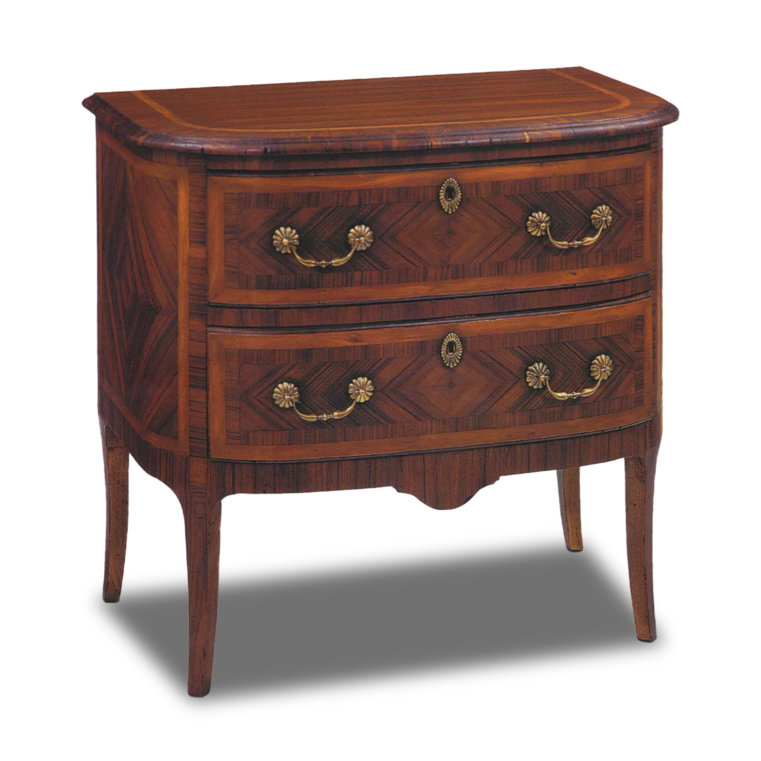 Made of primavera wood. Details in rosewood and yew veneer, and antiqued brass hardware.