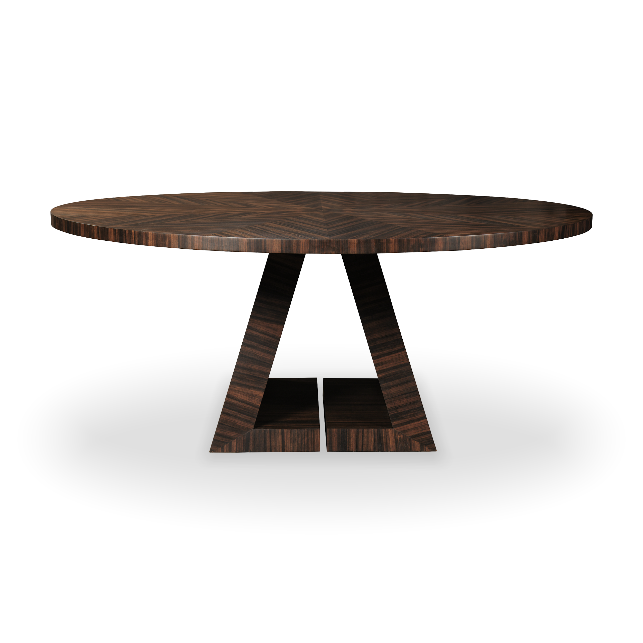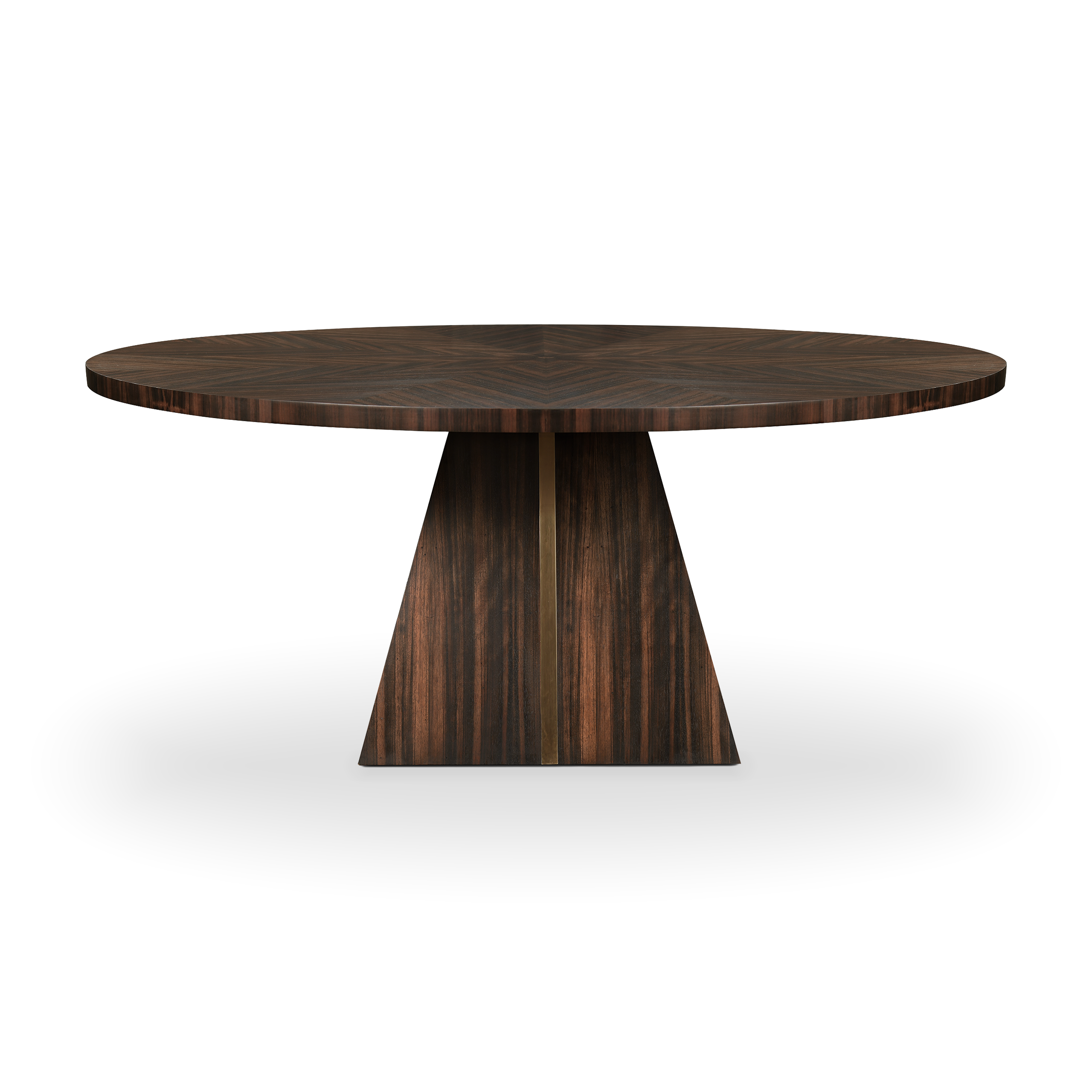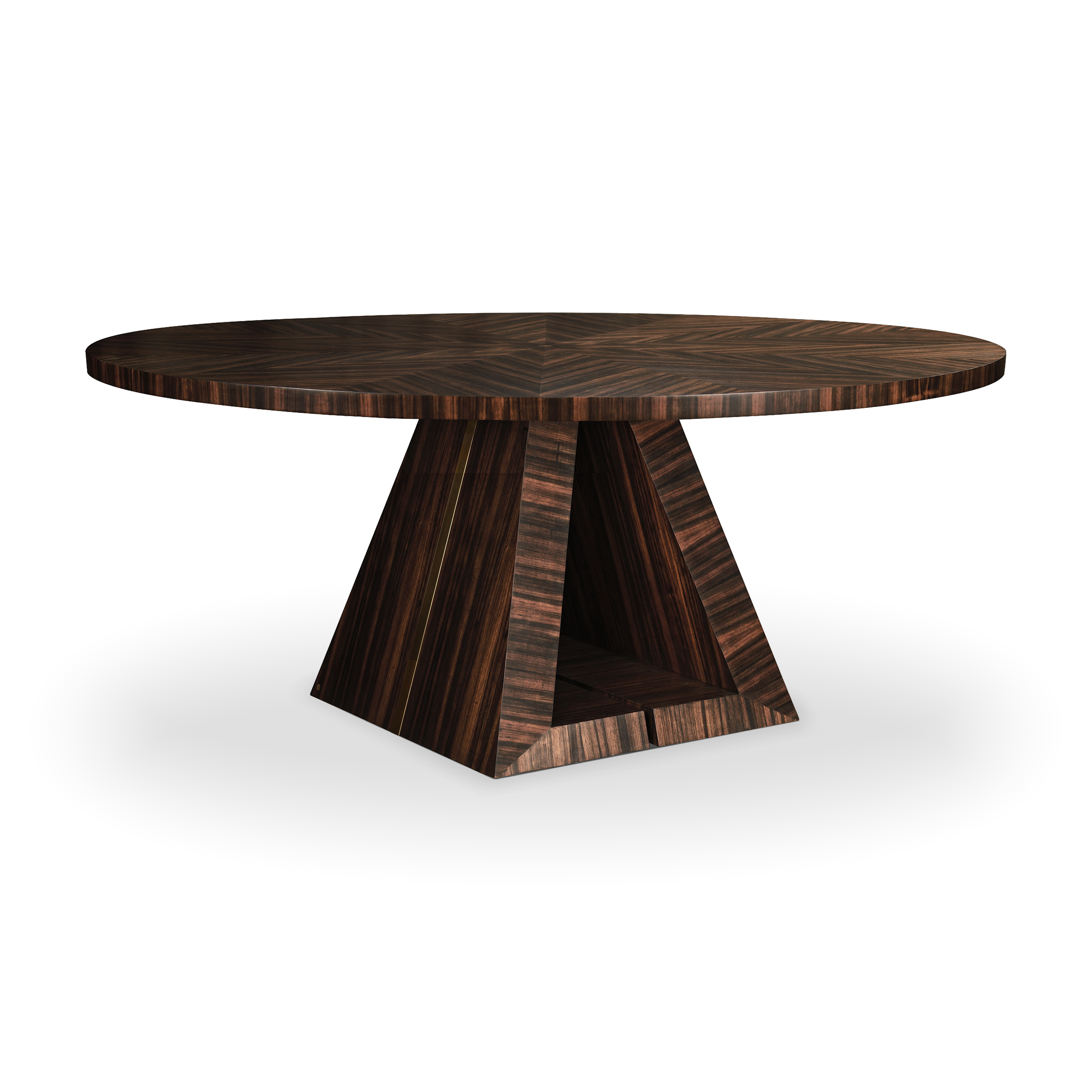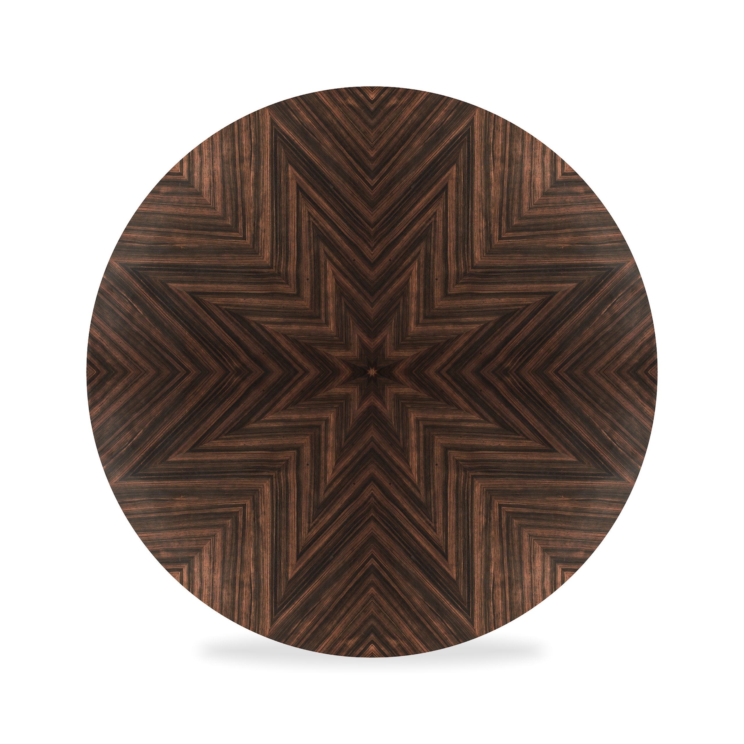 This ebony veneered dining table has a triangle-shaped base that is adorned with a brass strip on its side. The tabletop has a unique star design, complete with a waxed finish.