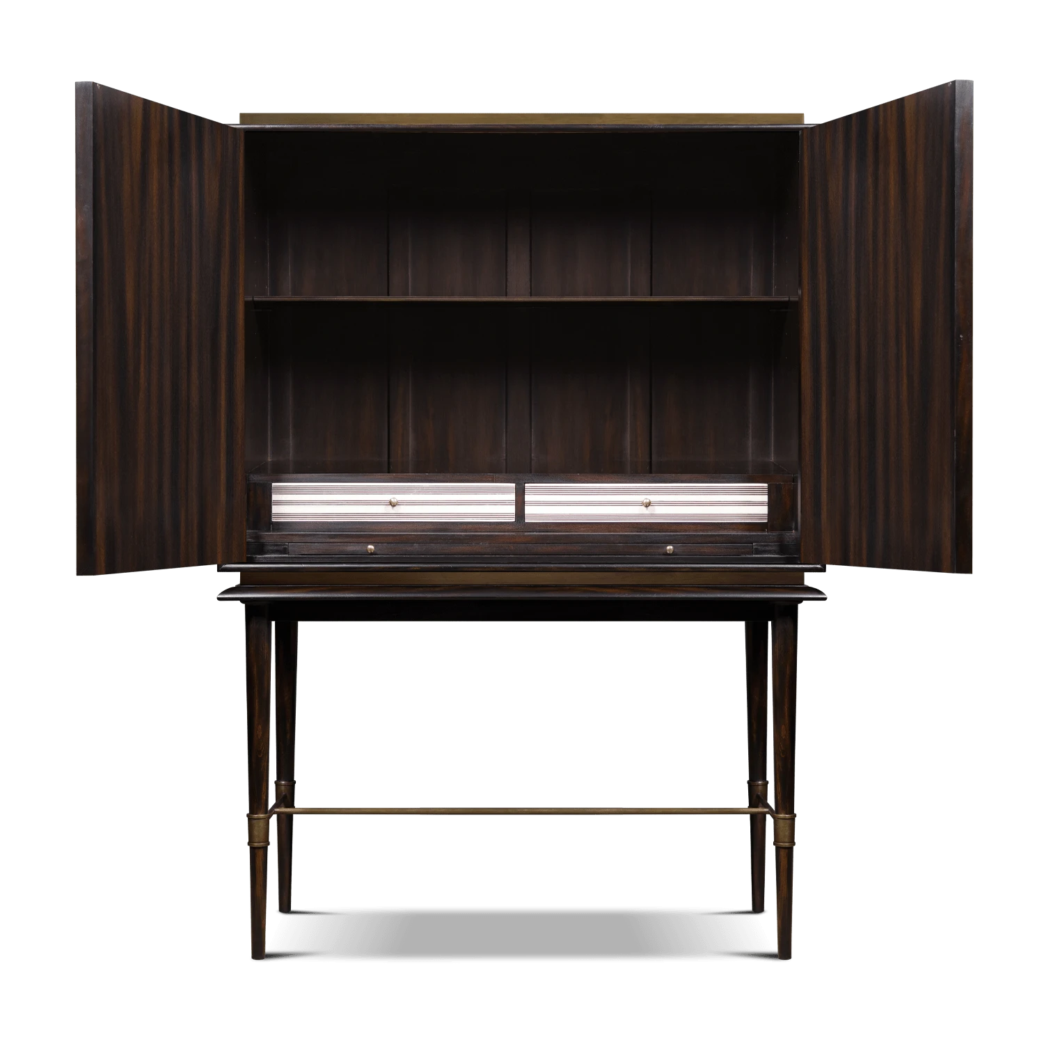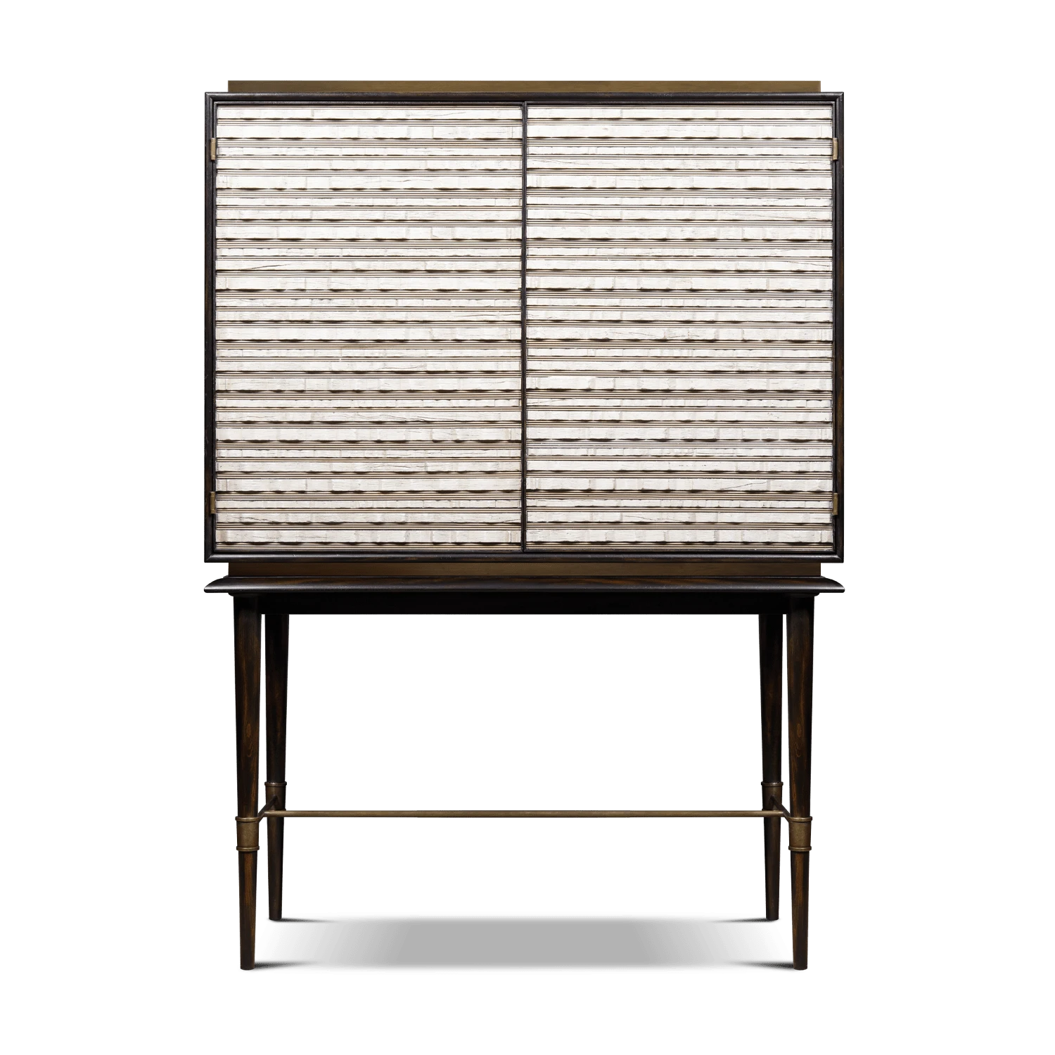 The Tourmont cabinet on stand was inspired by natural and irregular patterns found in mountainous rocks highlighted by a dark frame. The cabinet has a brass base and top which lies on an elegant stand that has delicate pointed legs with a brass crosspiece.