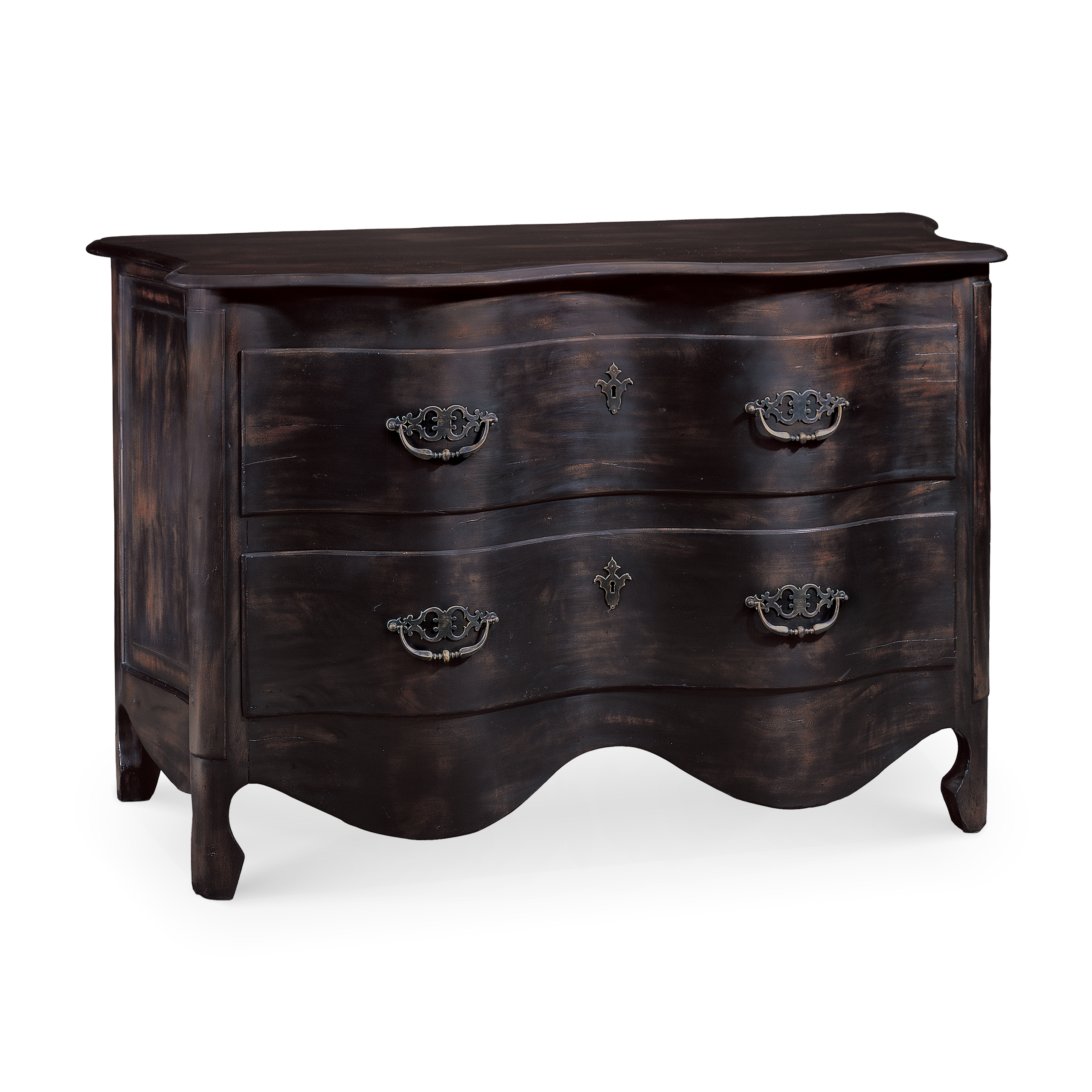 Chest of drawers inspired by 18th century German baroque style furniture, with a serpentine front and top. It has two large drawers with hardware that enhance its design.