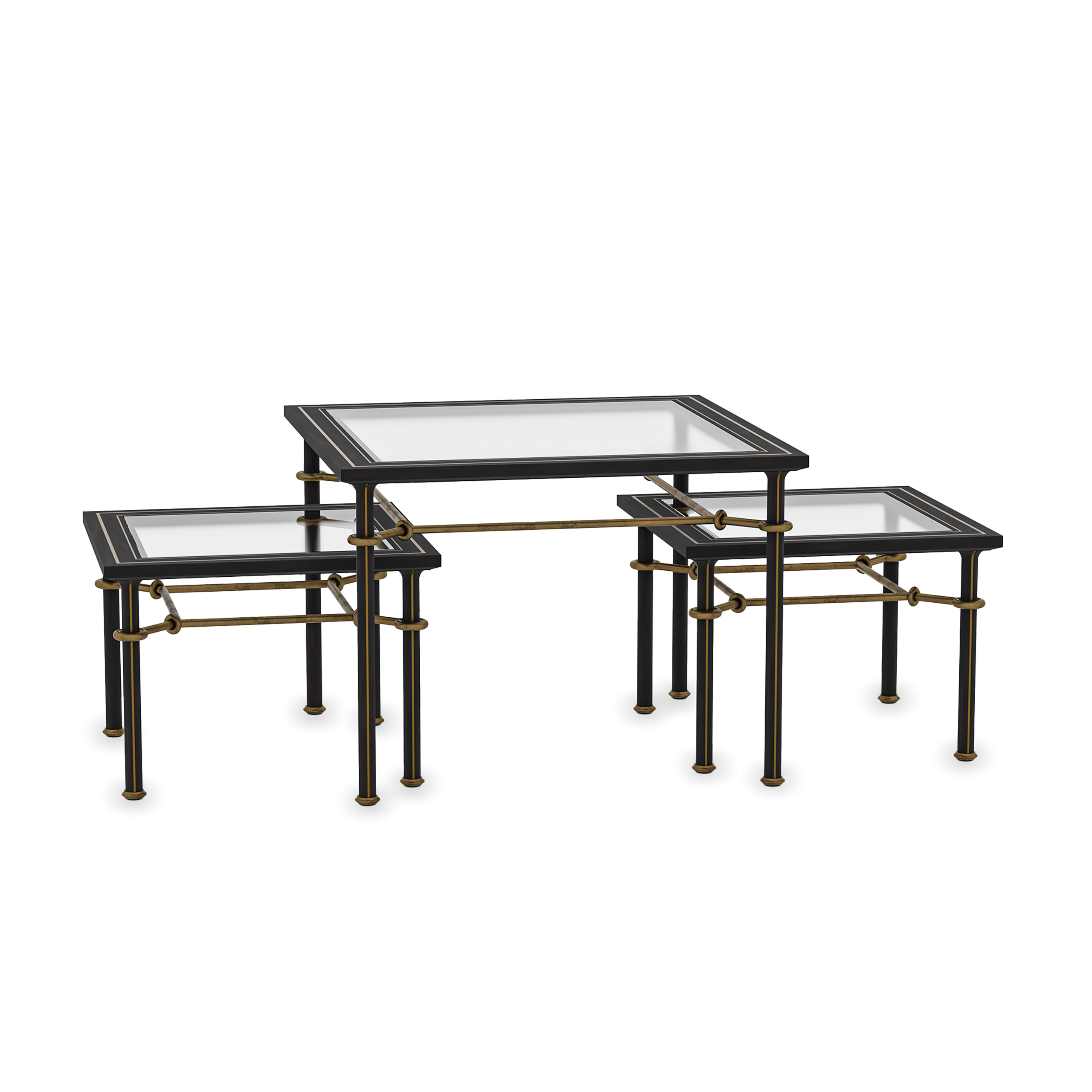 The Varenne Cocktail Table combines proportion, precision, and elegance. Its wooden structure features brass inlaid lines along the legs, which are finished with brass caps at the base. Brass stretchers, arranged in an enveloping composition, connect the legs and provide structural balance. The glass top, framed with two fine gold fillets, enhances the purity of the design and subtly reflects the light. Conceived as a nesting table set, it offers versatility and balance in any setting. Every element expresses the harmony and refinement that distinguish Alfonso Marina.