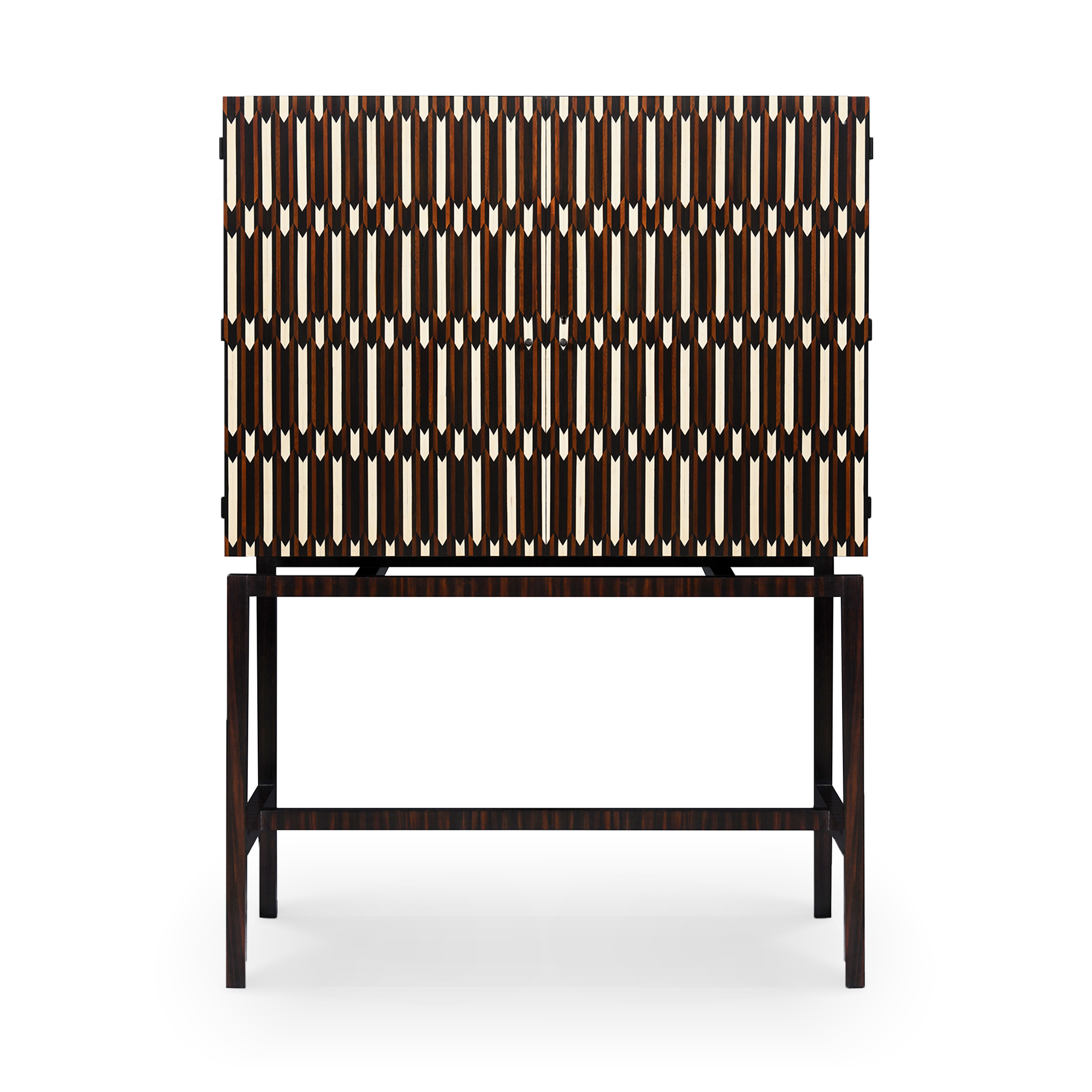 Este armario tiene un estilo contemporáneo con un intrincado diseño compuesto por diferentes tipos de madera e impresionantes incrustaciones de hueso. Su base de ébano exhibe sencillas líneas rectas que hacen perfecta armonía con el armario, que en contraste es más elaborado.