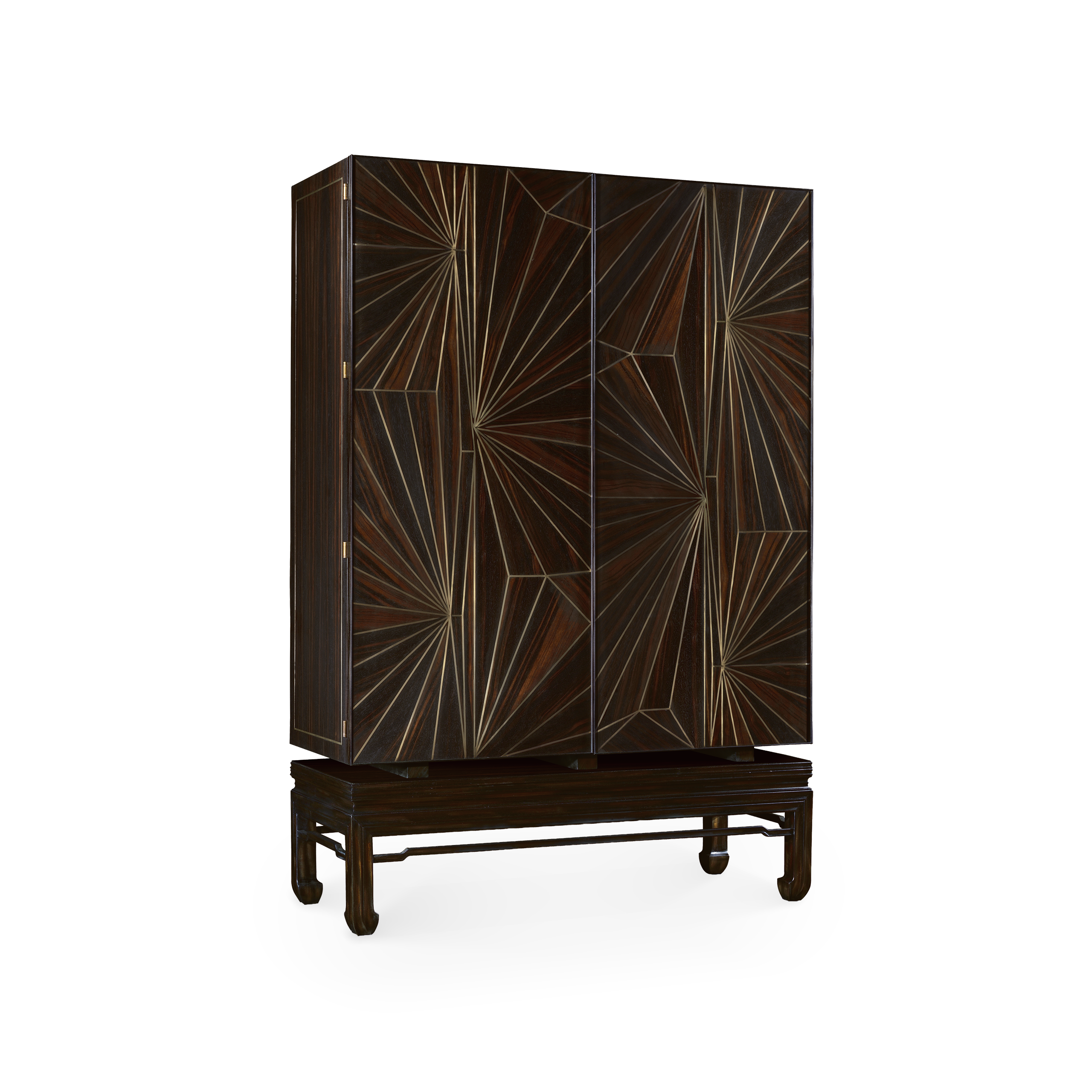 Armario diseñado como mueble para bar, con chapa de ébano e intrincadas incrustaciones de latón, será la pieza central de un interior ecléctico y vanguardista. El mueble destaca por su fascinante combinación de tonos e intrincados diseños, que muestran una armoniosa interacción entre los tonos oscuros de la madera y los luminosos acentos del latón. Su diseño de estrella decorado en latón eleva el entorno donde se encuentre Los intrincados patrones y el cautivador color del mueble, junto con su practicidad, lo convierten en una pieza atemporal que no sólo sirve para iniciar una conversación, sino que también mejora el atractivo estético general y la funcionalidad de cualquier habitación.