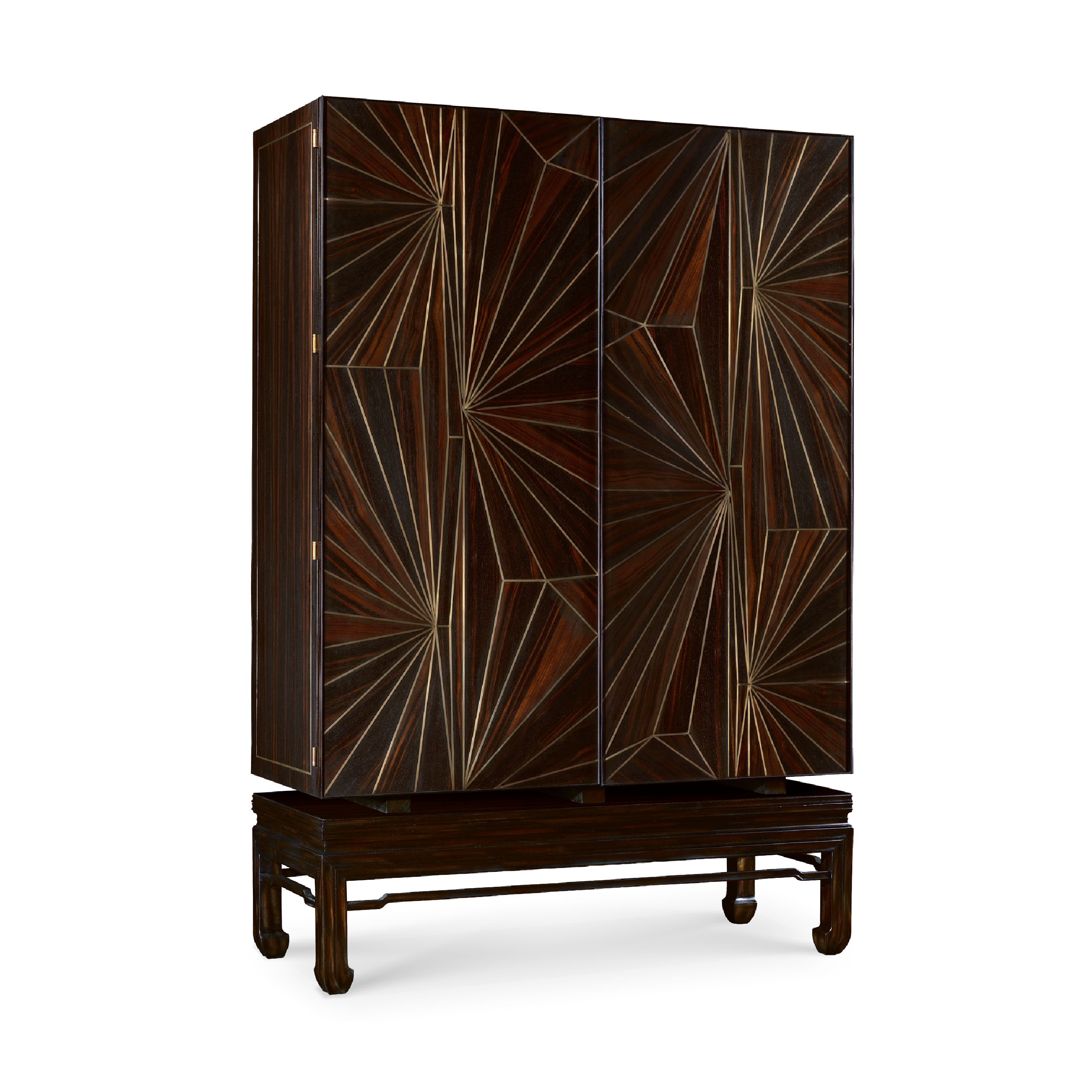 Armario diseñado como mueble para bar, con chapa de ébano e intrincadas incrustaciones de latón, será la pieza central de un interior ecléctico y vanguardista. El mueble destaca por su fascinante combinación de tonos e intrincados diseños, que muestran una armoniosa interacción entre los tonos oscuros de la madera y los luminosos acentos del latón. Su diseño de estrella decorado en latón eleva el entorno donde se encuentre Los intrincados patrones y el cautivador color del mueble, junto con su practicidad, lo convierten en una pieza atemporal que no sólo sirve para iniciar una conversación, sino que también mejora el atractivo estético general y la funcionalidad de cualquier habitación.