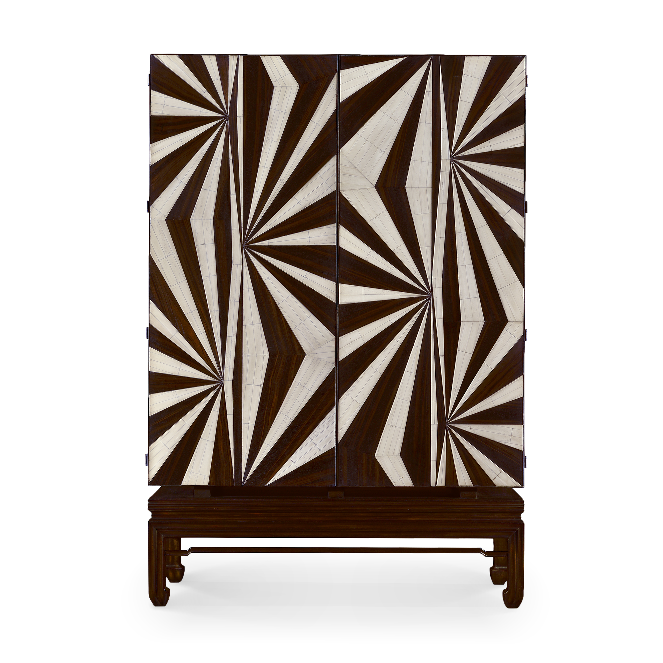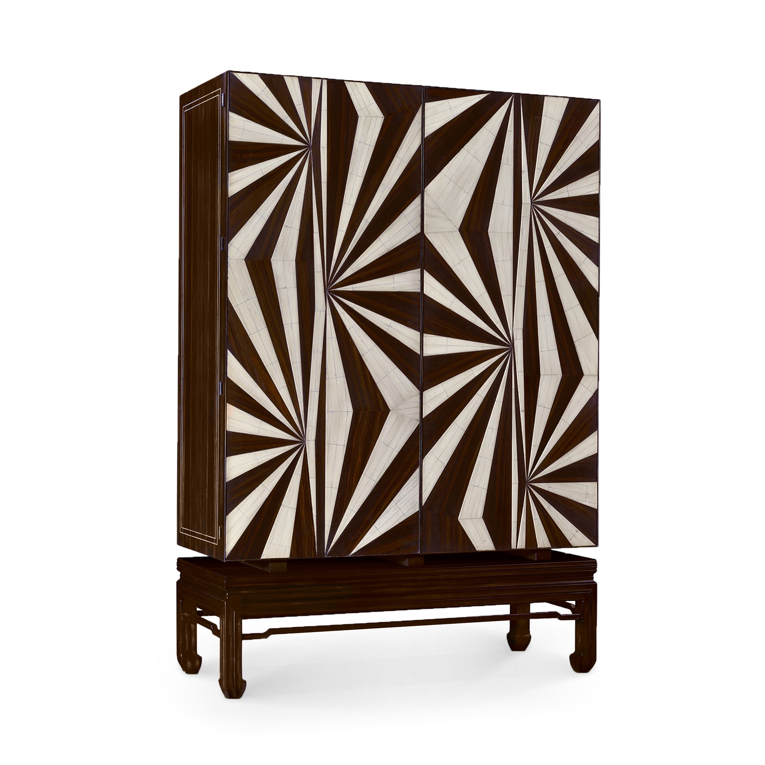 Este armario estรก diseรฑado para bar, enchapado en รฉbano y decorado con intrincadas incrustaciones de hueso, serรก la pieza central de un interior eclรฉctico y sofisticado. El mueble irradia elegancia con su combinaciรณn de tonos y elaborados patrones, mostrando una armoniosa interacciรณn entre los oscuros tonos de la madera y los luminosos acentos del hueso. El diseรฑo en forma de estrella decorado en hueso, realza el ambiente general del espacio donde se encuentre. Los intrincados diseรฑos y cautivadores colores del mueble, unidos a su practicidad, lo convierten en una pieza atemporal que no sรณlo sirve para iniciar una conversaciรณn, sino que tambiรฉn aumenta el atractivo estรฉtico general y la funcionalidad de cualquier habitaciรณn. La meditada disposiciรณn de los elementos y la cuidadosa selecciรณn de los motivos se combinan para crear una atmรณsfera cautivadora e intrigante en este interior de exquisito diseรฑo.
