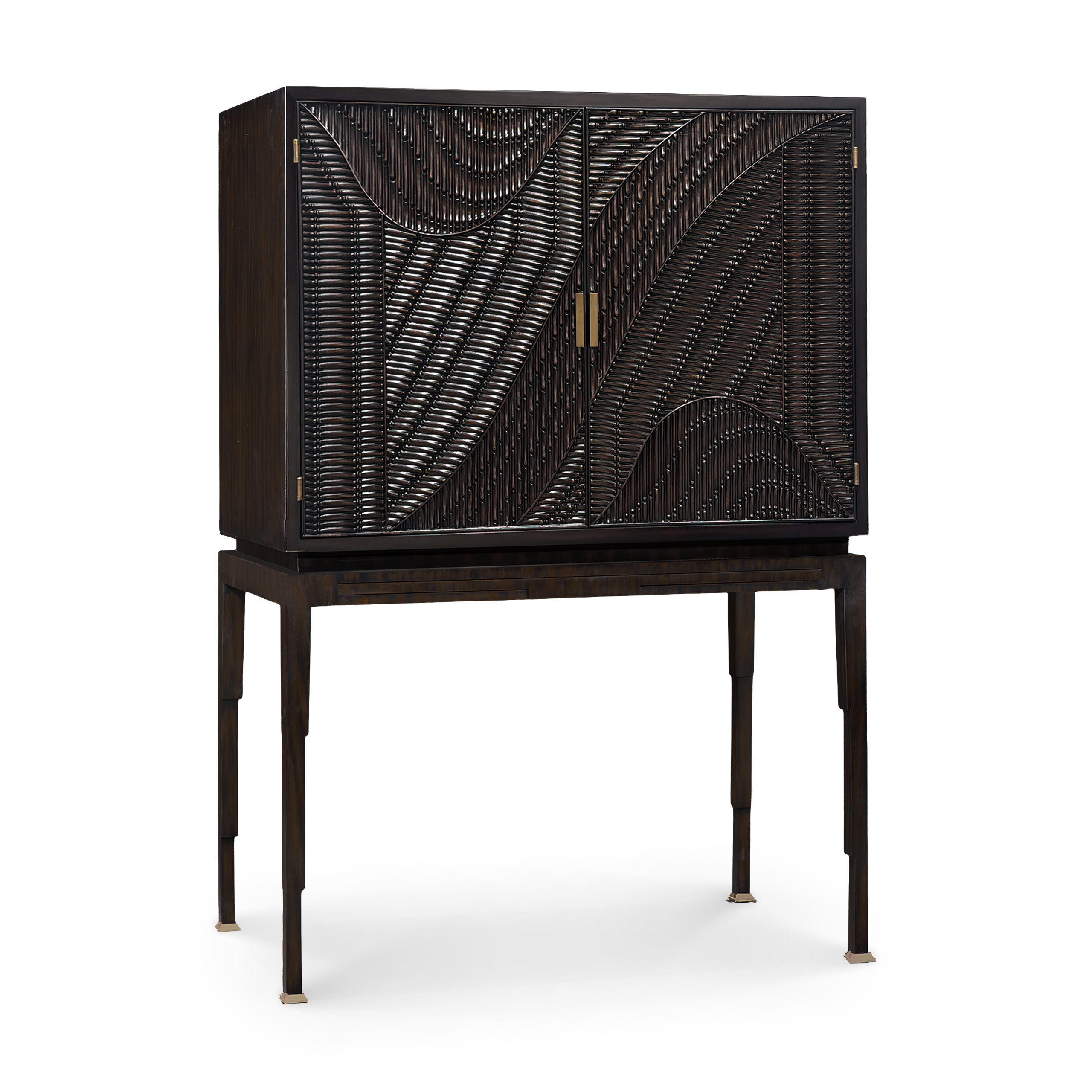 El Armario Éole destaca por la riqueza de su superficie y la elegancia de su composición. Las puertas están formadas por molduras dispuestas en distintas direcciones, creando un relieve que sigue el movimiento del diseño y genera una textura cambiante de luces y sombras. El herraje de latón aporta un acento cálido y sofisticado que equilibra la fuerza visual del frente. En la base, un restirador amplía su funcionalidad y permite usarlo cómodamente como bar. Una pieza que combina precisión, carácter y refinamiento.