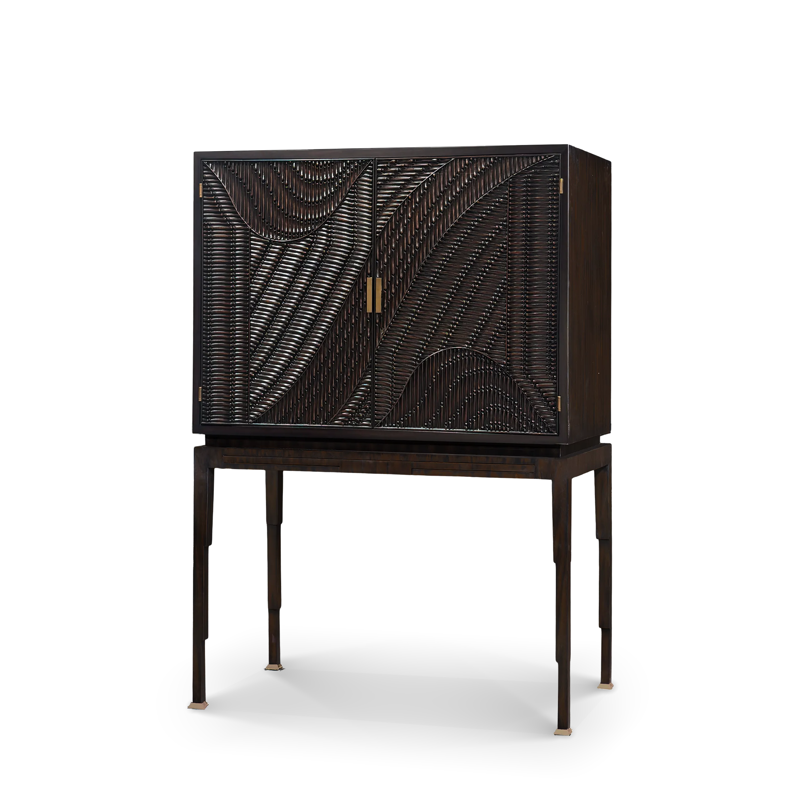 El Armario Éole destaca por la riqueza de su superficie y la elegancia de su composición. Las puertas están formadas por molduras dispuestas en distintas direcciones, creando un relieve que sigue el movimiento del diseño y genera una textura cambiante de luces y sombras. El herraje de latón aporta un acento cálido y sofisticado que equilibra la fuerza visual del frente. En la base, un restirador amplía su funcionalidad y permite usarlo cómodamente como bar. Una pieza que combina precisión, carácter y refinamiento.
