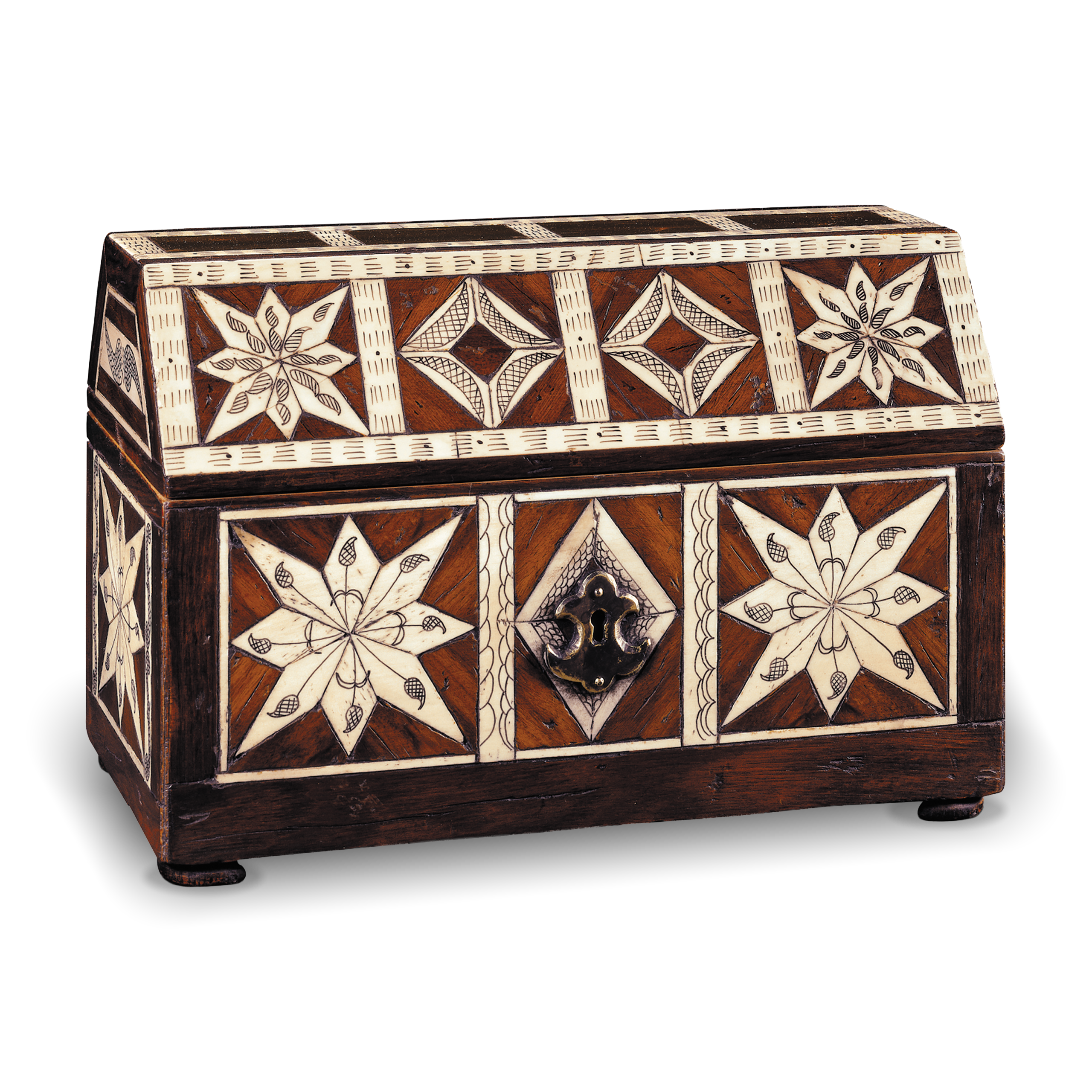 Madera cedro rojo, marquetería en cedro rojo, taracea de hueso esgrafiado, granadillo y palo de rosa con herraje en latón pavonado.