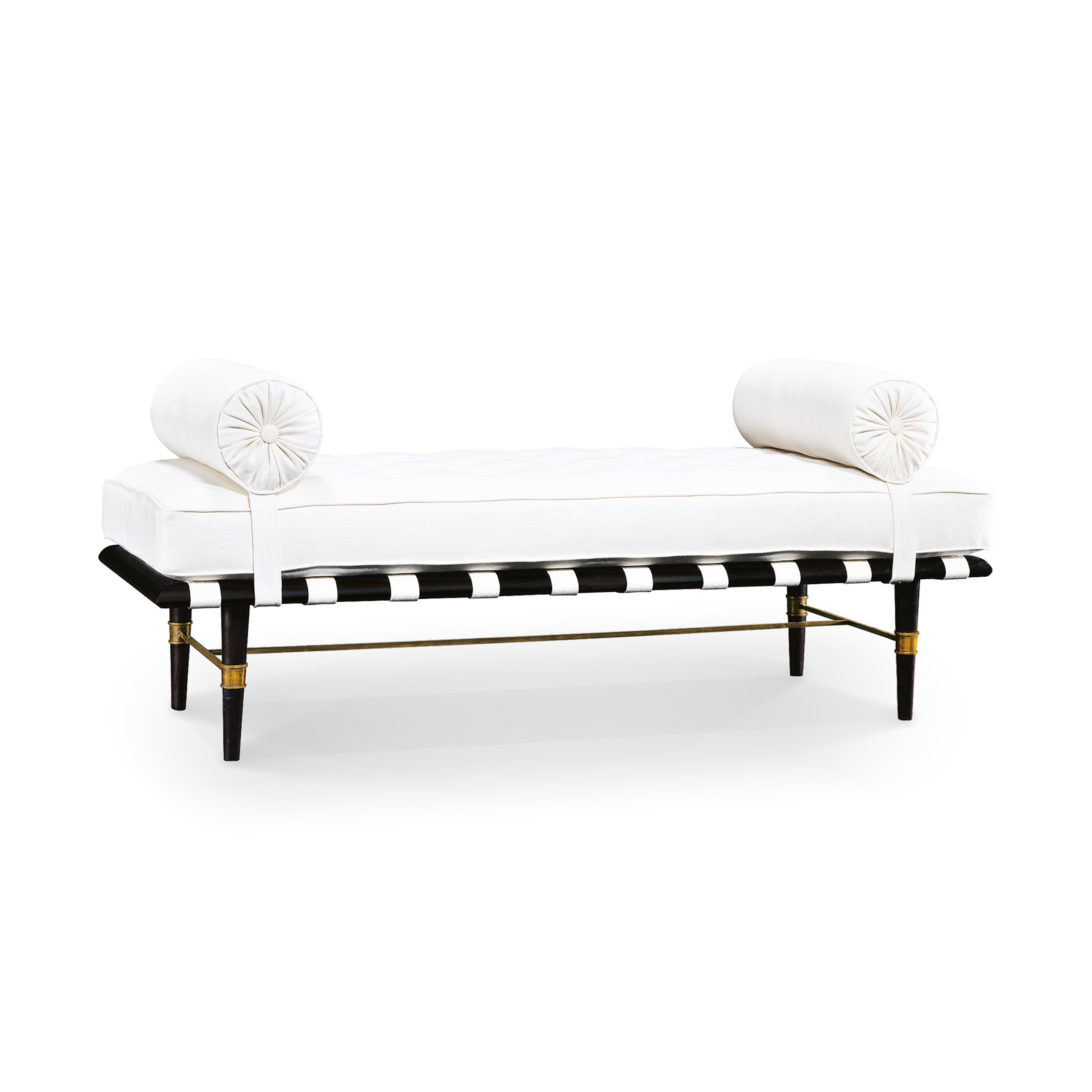 Se trata de una banca de inspiración Moderna de mediados de siglo, de 1960-1969, con asiento empenachado y un rodillo tapizado a cada lado, patas cónicas y detalles de latón envejecido.