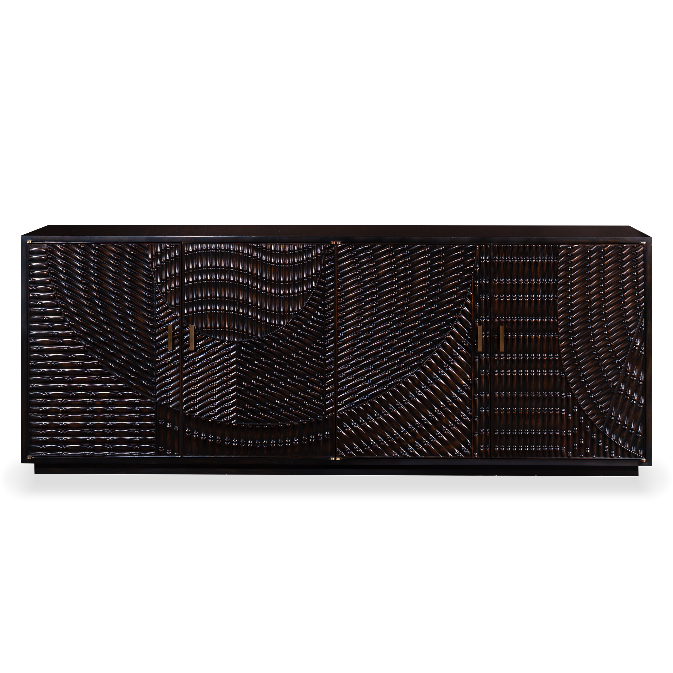 El Buffete Laumont se distingue por la riqueza visual de su superficie y la pureza de sus proporciones. Su frente está compuesto por molduras dispuestas en diferentes direcciones, creando un relieve que sugiere movimiento y profundidad. El herraje de latón introduce un acento cálido y elegante que resalta sobre el acabado oscuro de la madera. Esta pieza, de presencia escultórica y equilibrio formal, refleja la maestría con la que Alfonso Marina transforma la materia en diseño.