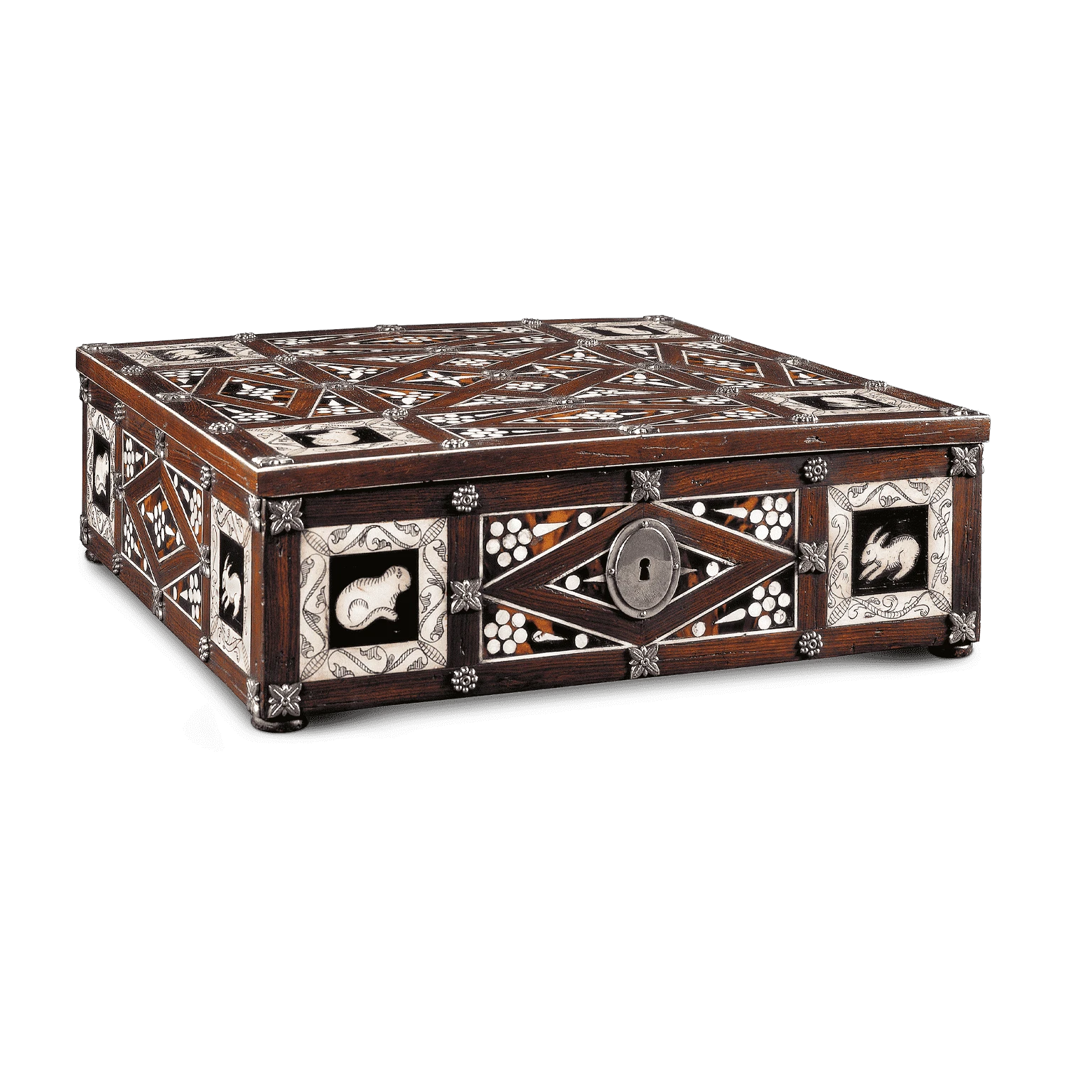 Caja decorativa muy bella y detallada. Cada parte que conforma esta pieza es una joya por sí misma: incrustaciones de latón, nácar, hueso esgrafiado e imitación de carey.