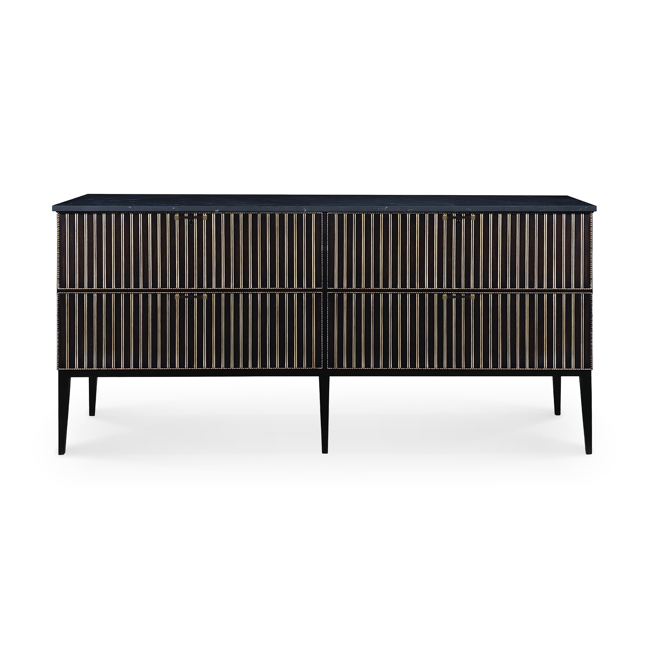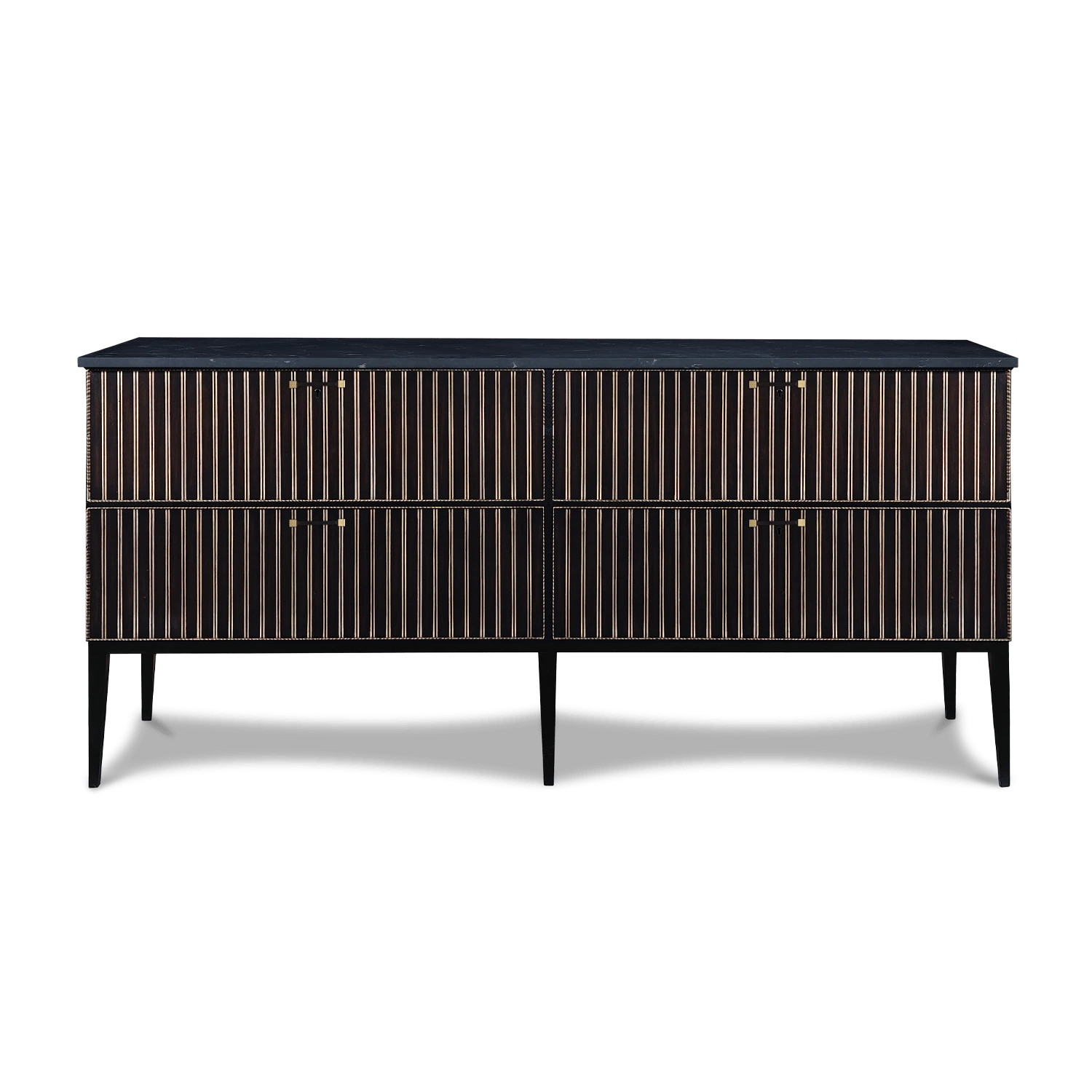 Madera primavera, detalles de marqueterรญa en chapas de maple, huanacastle y primavera, herrajes en latรณn anticado, cubierta de mรกrmol Negro Monterrey satinado.