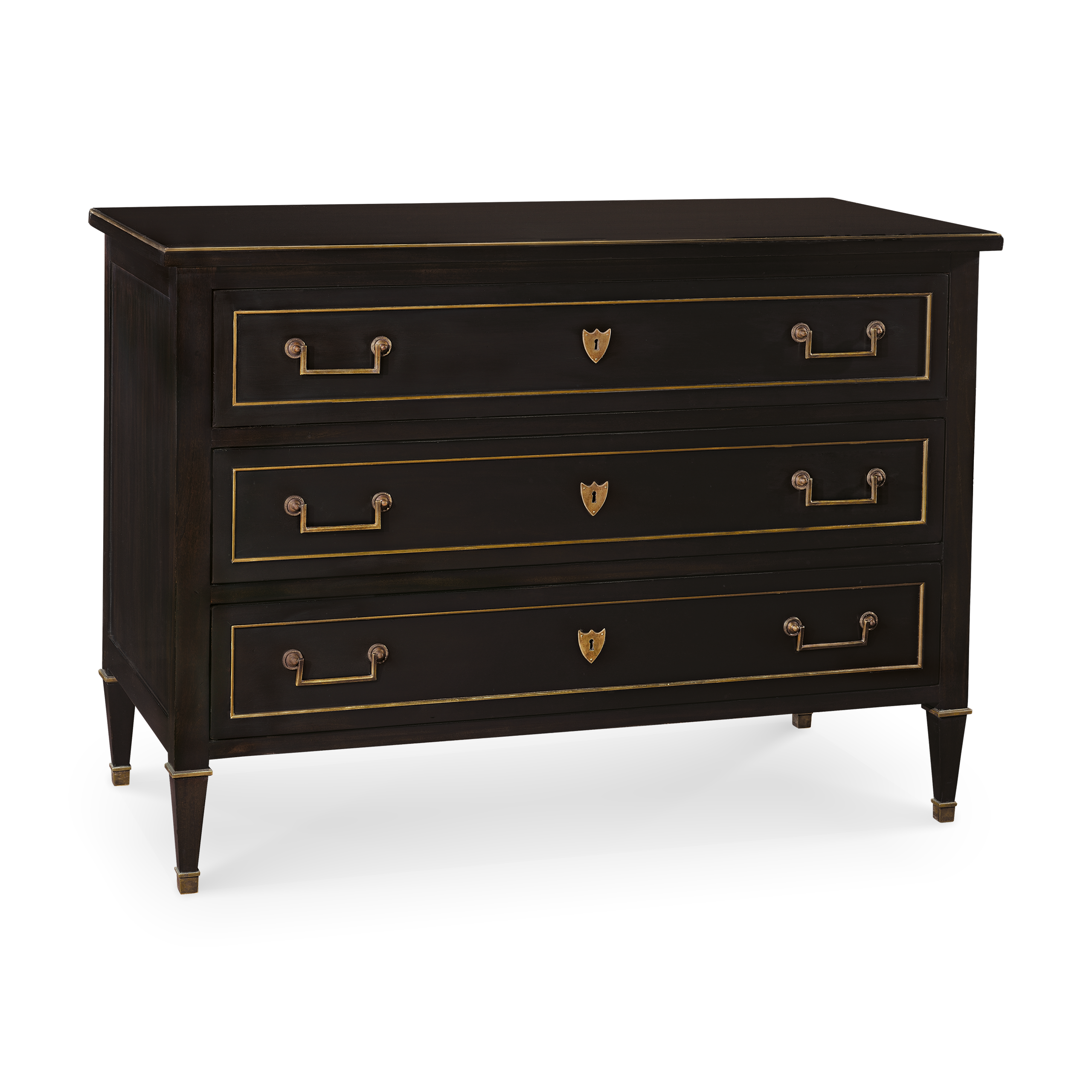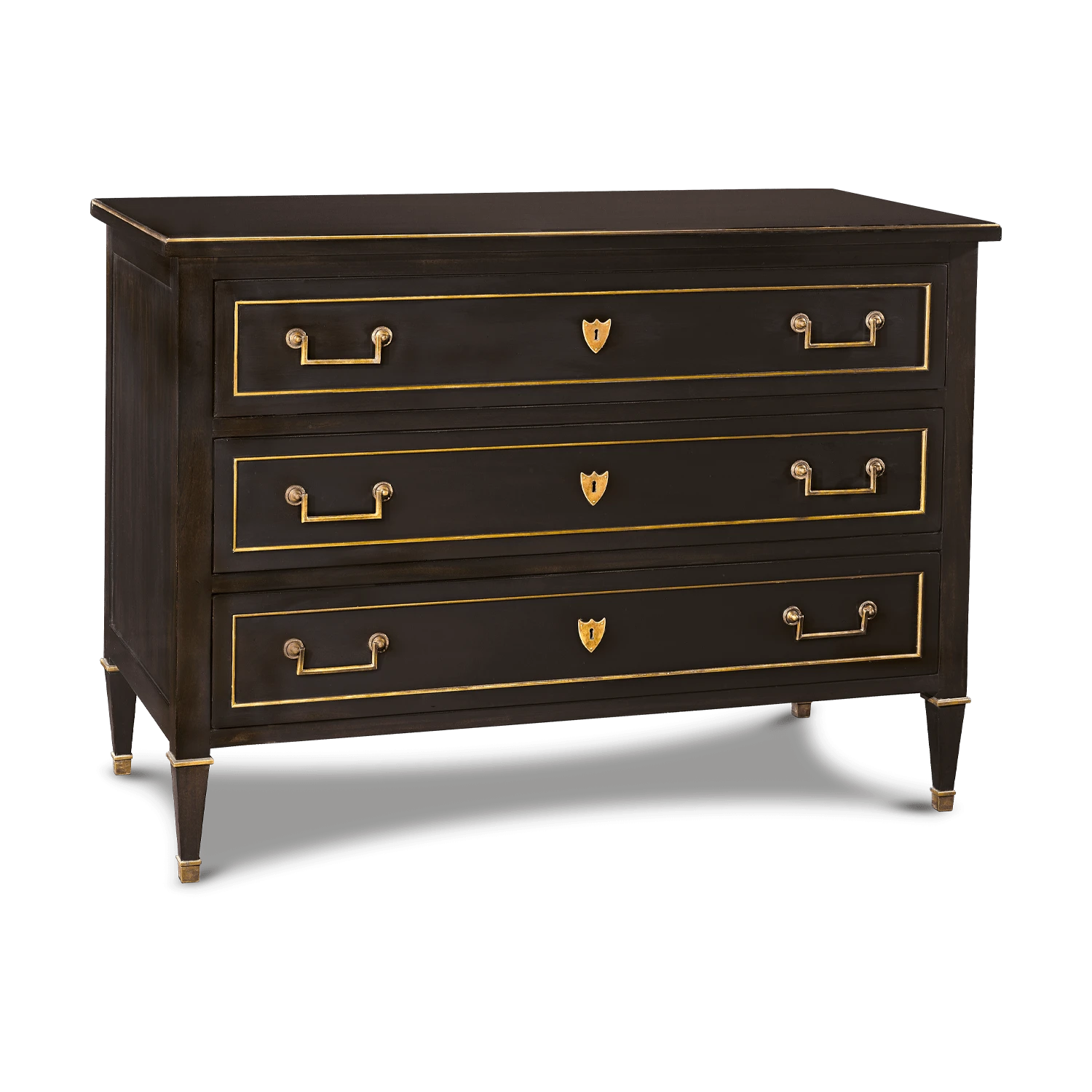 Esta cรณmoda neoclรกsica francesa, fabricada en madera ebonizada, es un testimonio de elegancia atemporal. El tono oscuro de la madera contrasta con los intrincados detalles de latรณn. Las incrustaciones de latรณn en las molduras dan un toque de opulencia, mientras que los contornos de los cajones acentรบan su refinado diseรฑo. Cada cajรณn estรก decorado con herrajes y bocallaves de latรณn, que no sรณlo ofrecen funcionalidad sino que tambiรฉn realzan el atractivo estรฉtico de la pieza. Los casquillos de latรณn en las patas, tรญpicas de la รฉpoca, aรฑaden un extra de detalle y lujo.