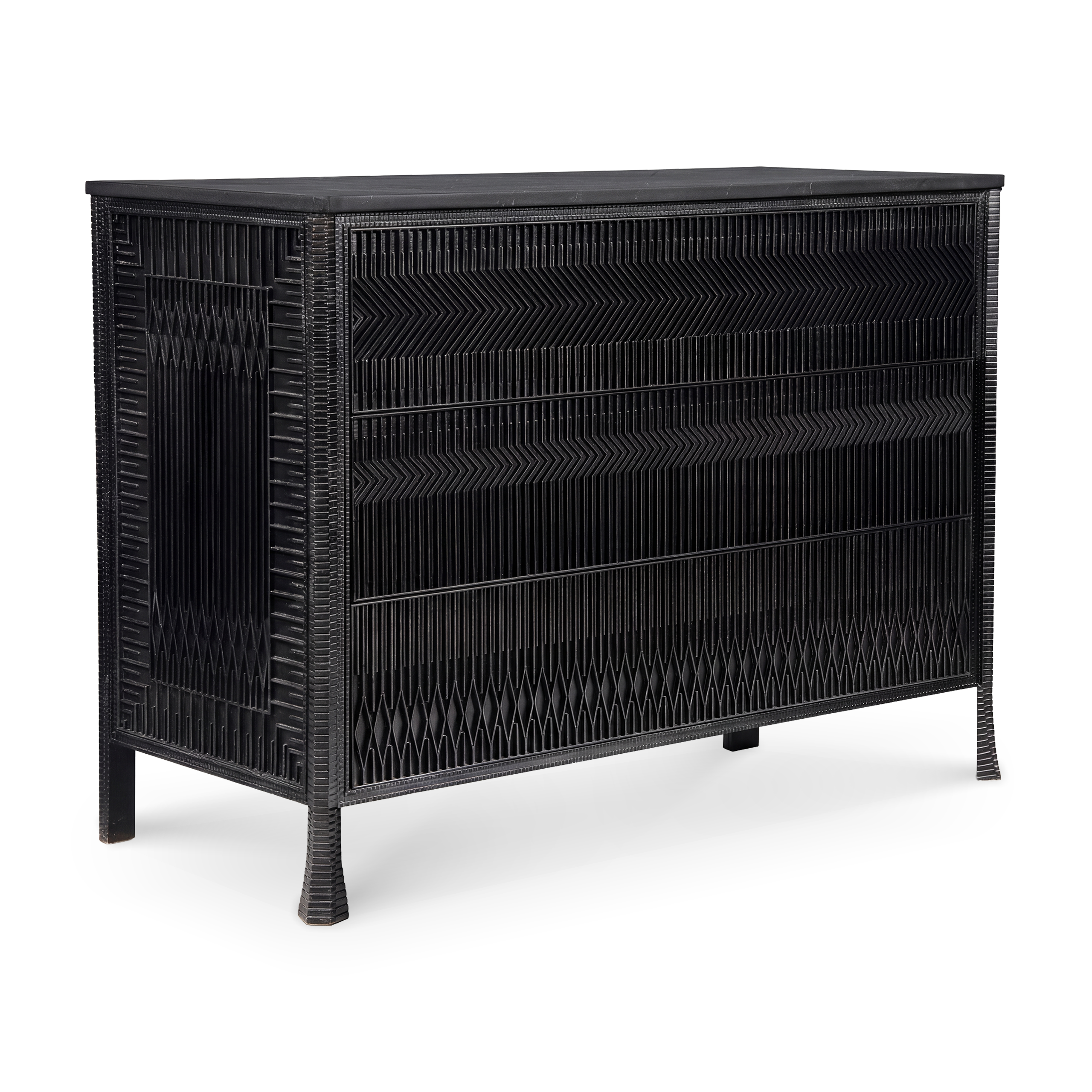 La atrevida cómoda Beaumont se alza orgullosa. El impresionante mármol negro acentúa la complejidad de su diseño geométrico. Una cuidadosa combinación de precisión mecánica y técnica manual. Esta belleza caleidoscópica está hecha para destacar y se apoya en unas delicadas y fuertes patas de alas abiertas.