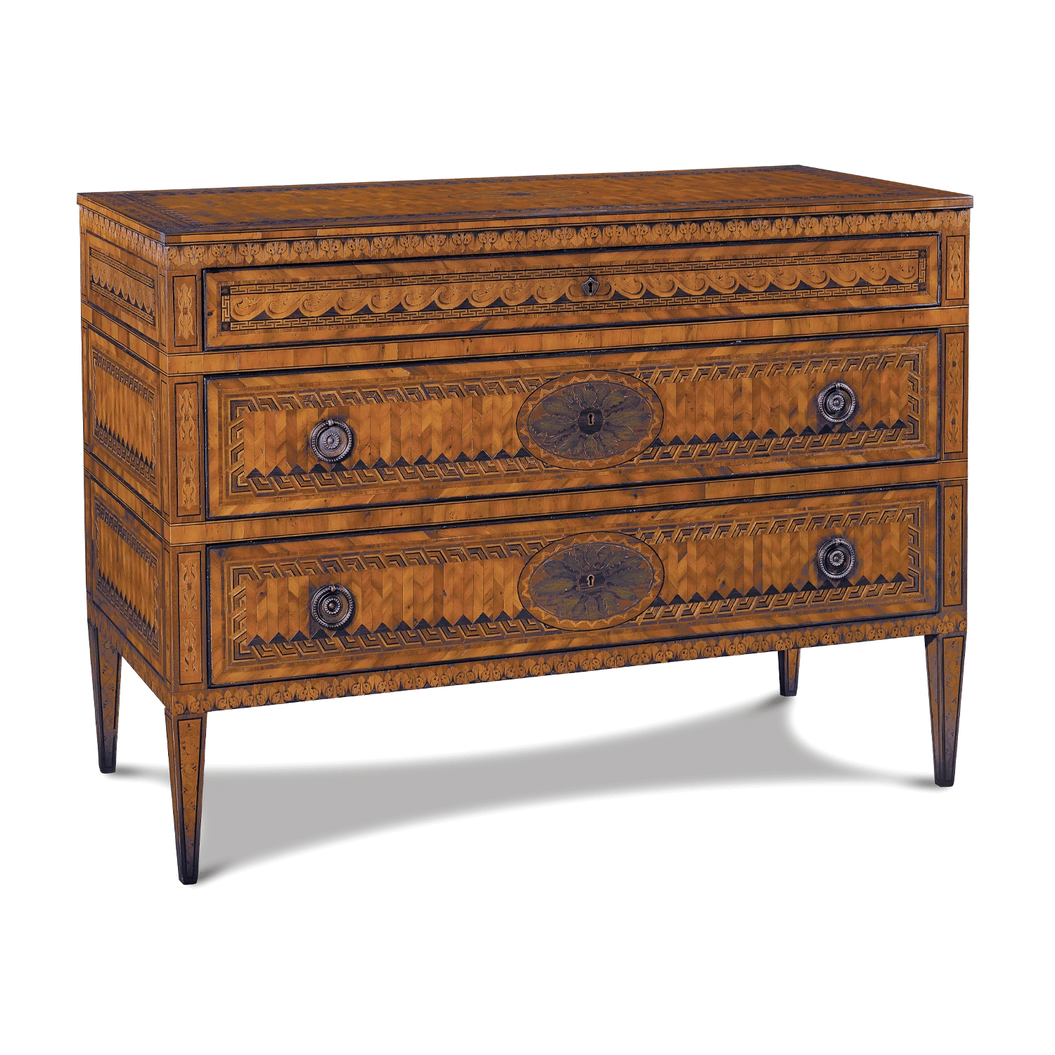 La cรณmoda Napoli estรก inspirada en el estilo neoclรกsico Italiano. Estรก decorada con una intrincada marqueterรญa que presenta motivos detallados que adornan toda la cubierta. Los detalles caracterรญsticos de la รฉpoca neoclรกsica evocan un aire de lujo y arte. La cรณmoda es de gran tamaรฑo y cuenta con mรบltiples cajones que proporcionan un amplio espacio de almacenamiento. La madera de alta calidad, pulida hasta el mรกs mรญnimo detalle, junto con los diseรฑos intrincados, realzan su apariencia majestuosa. Cada cajรณn estรก equipado con herrajes de latรณn creando contraste con la madera. Esta cรณmoda captura la esencia de una รฉpoca que valoraba la belleza, la atenciรณn al detalle y el arte, convirtiรฉndola en el centro de atenciรณn y el tema de conversaciรณn en cualquier habitaciรณn.