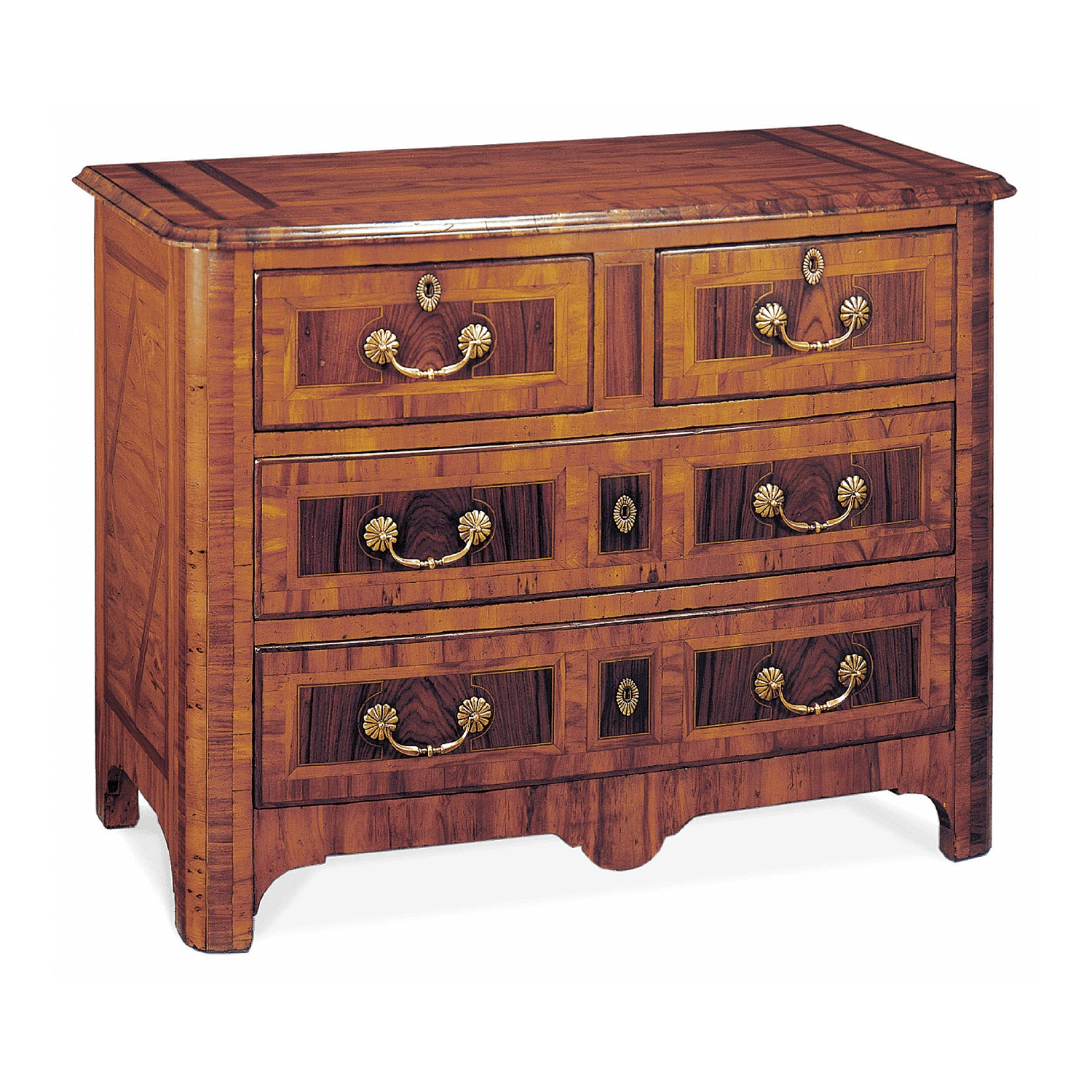 Madera primavera con chapas de maple, palo de rosa, yew, chechen y nogal, herrajes en latón anticado.