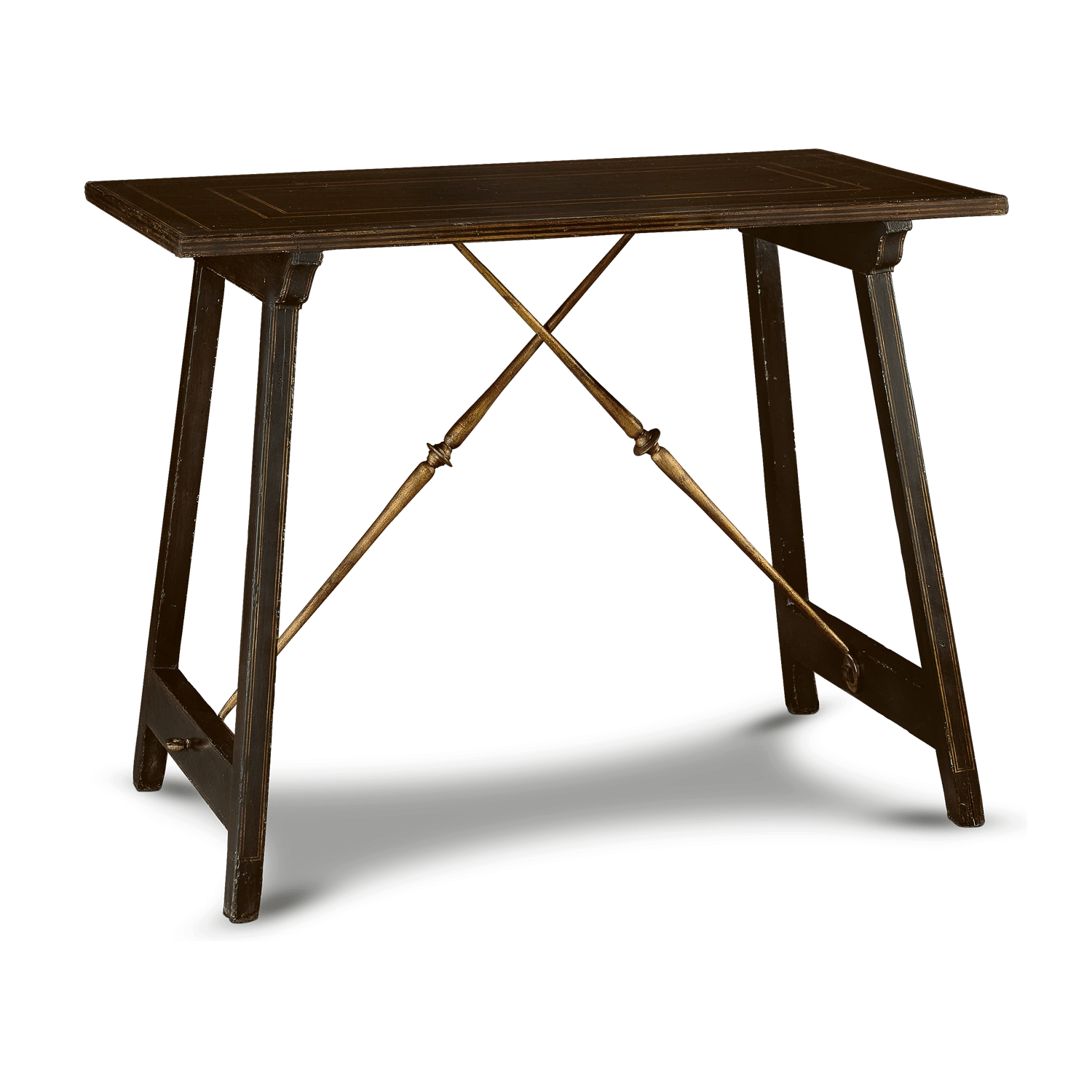 Pequeรฑa consola negra con detalles dorados, inspirada en el estilo espaรฑol. Su soporte diagonal dorado entrecruzado aรฑade un detalle รบnico, mientras que la parte superior en voladizo estรก decorada con delicadas incrustaciones doradas, al igual que las patas.