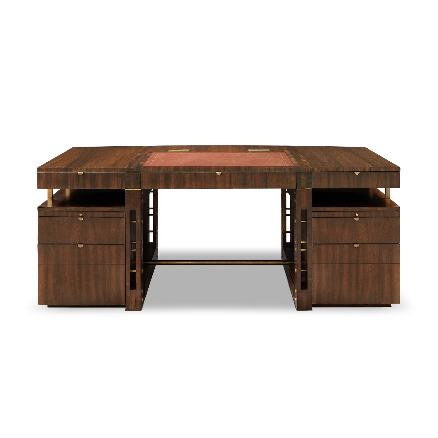Un escritorio funcional y detallado. Está fabricado con chapa de madera koa y revestimiento de piel. Además, cuenta con una amplia variedad de cajones, algunos de ellos ocultos y con compartimentos especiales para una organización eficiente. Los detalles y decoraciones, como el compartimento para ocultar los cables, están hechos en latón.