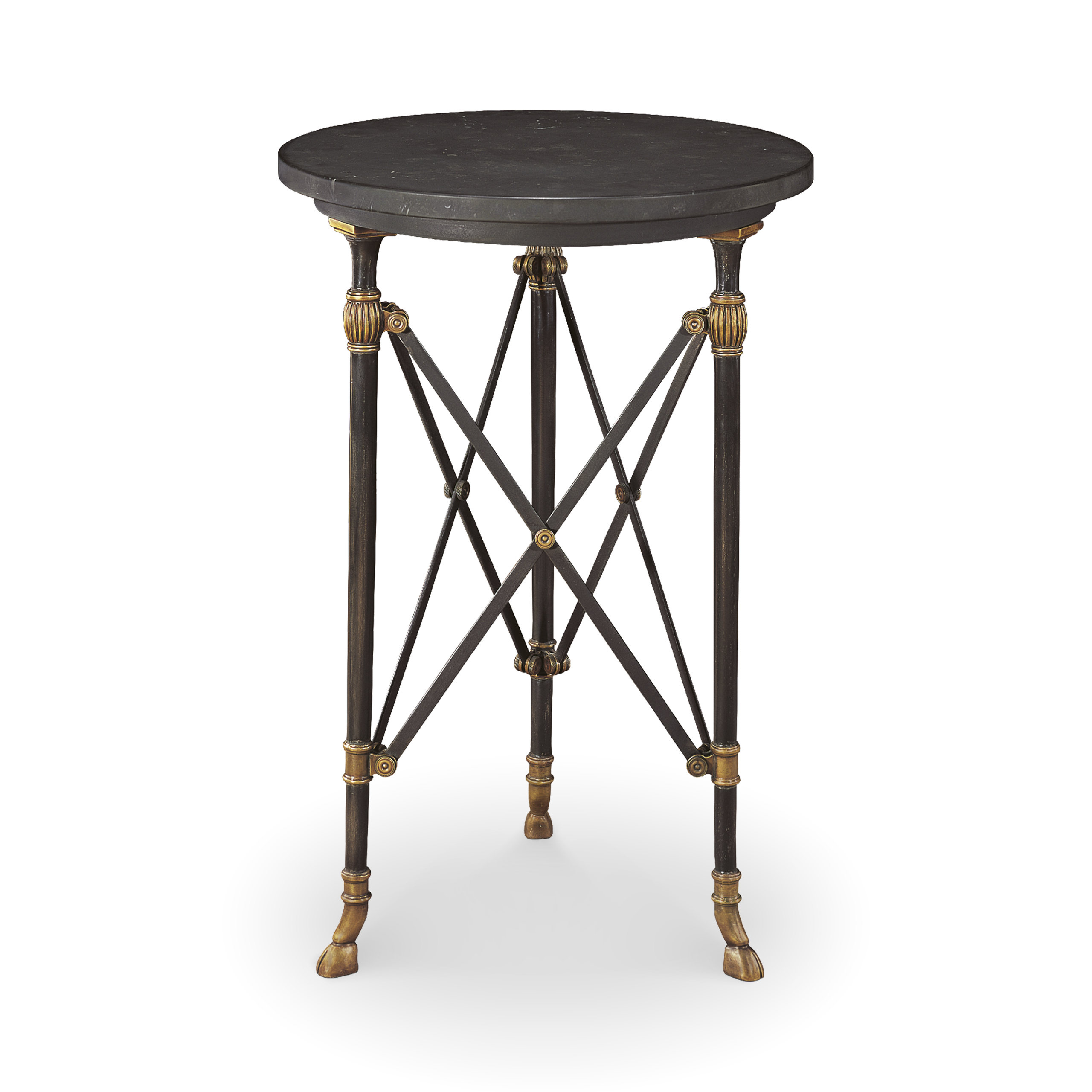 La Mesa auxiliar Reuil es una mezcla de elegancia clásica y diseño contemporáneo. Tiene una cubierta de mármol negro, que ofrece una superficie elegante y pulida que contrasta con la calidez de sus patas de madera interconectadas con crucetas de metal negro, que proporcionan tanto integridad estructural como un toque estético moderno. Los herrajes de latón en los puntos de unión de las crucetas con las patas realzan el diseño de la mesa. Una característica destacada de la mesa es la terminación de latón en forma de “pata de cabra” en la base de cada pata. La combinación del mármol negro, la madera y el latón culmina en una mesa que es a la vez funcional y llamativa, que recuerda a los diseños de una época pasada pero que se adapta perfectamente a los ambientes contemporáneos.