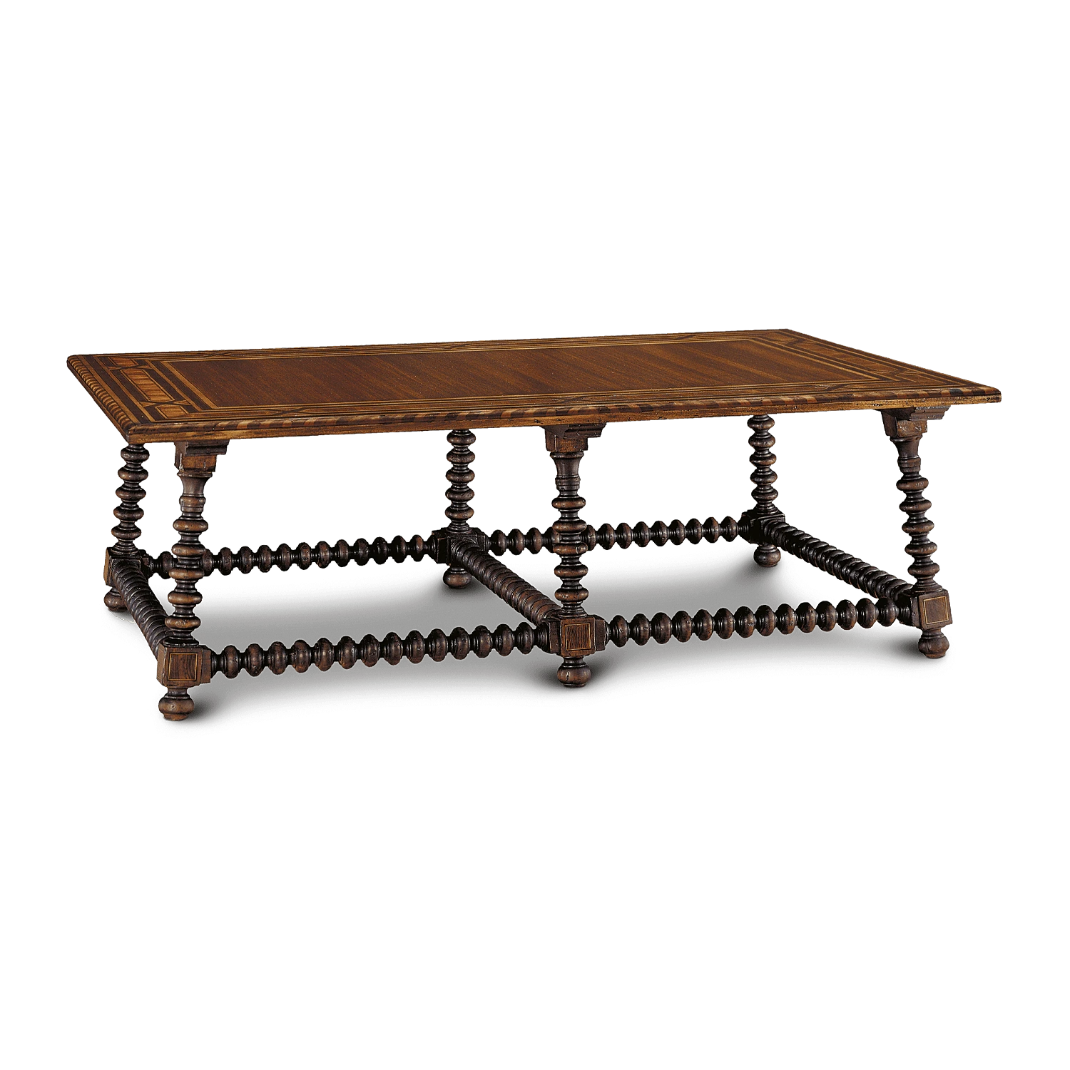 La exquisita mesa Estoril se inspira en el mobiliario portuguรฉs y espaรฑol del siglo XVII. La base tiene 6 patas torneadas a mano y la tapa presenta una moldura de caramelo en el borde y marqueterรญa creada con guanacastle, palisandro de cedro blanco y granadillo.