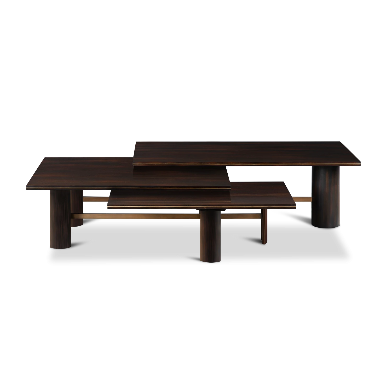 La Mesa de Centro Le Broc tiene 3 cubiertas de madera con incrustaciones de latón en los bordes, interconectados a diferentes alturas, lo que le confiere un estilo elegante y sobrio. Las patas tienen 2 estilos: madera torneada y patas curvadas, unidas por líneas lisas de latón.