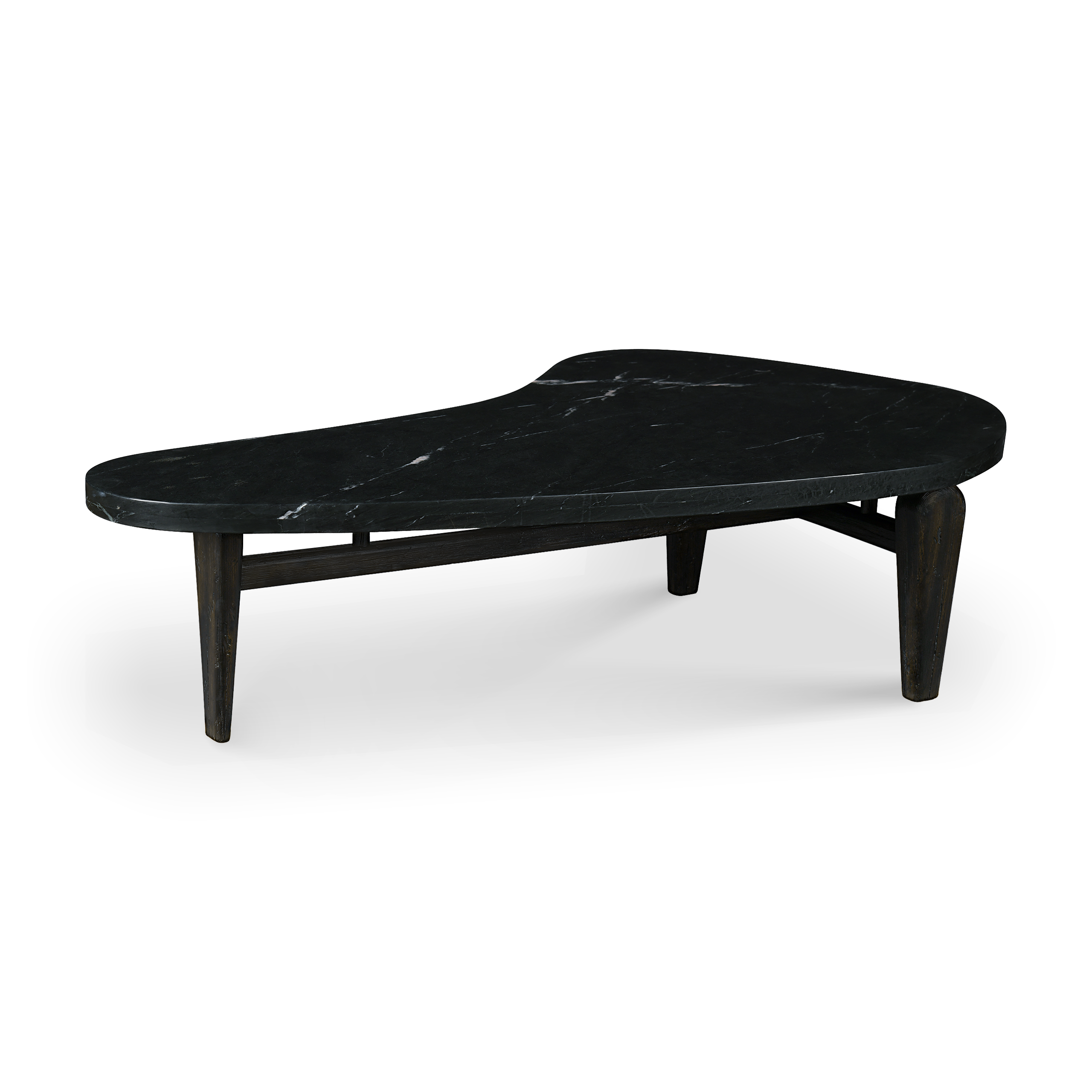 Se trata de una mesa de centro de forma orgรกnica con una impresionante cubierta de mรกrmol negro. Su base de madera tiene un acabado oscuro muy rรบstico que puede colocarse en cualquier tipo de decoraciรณn.