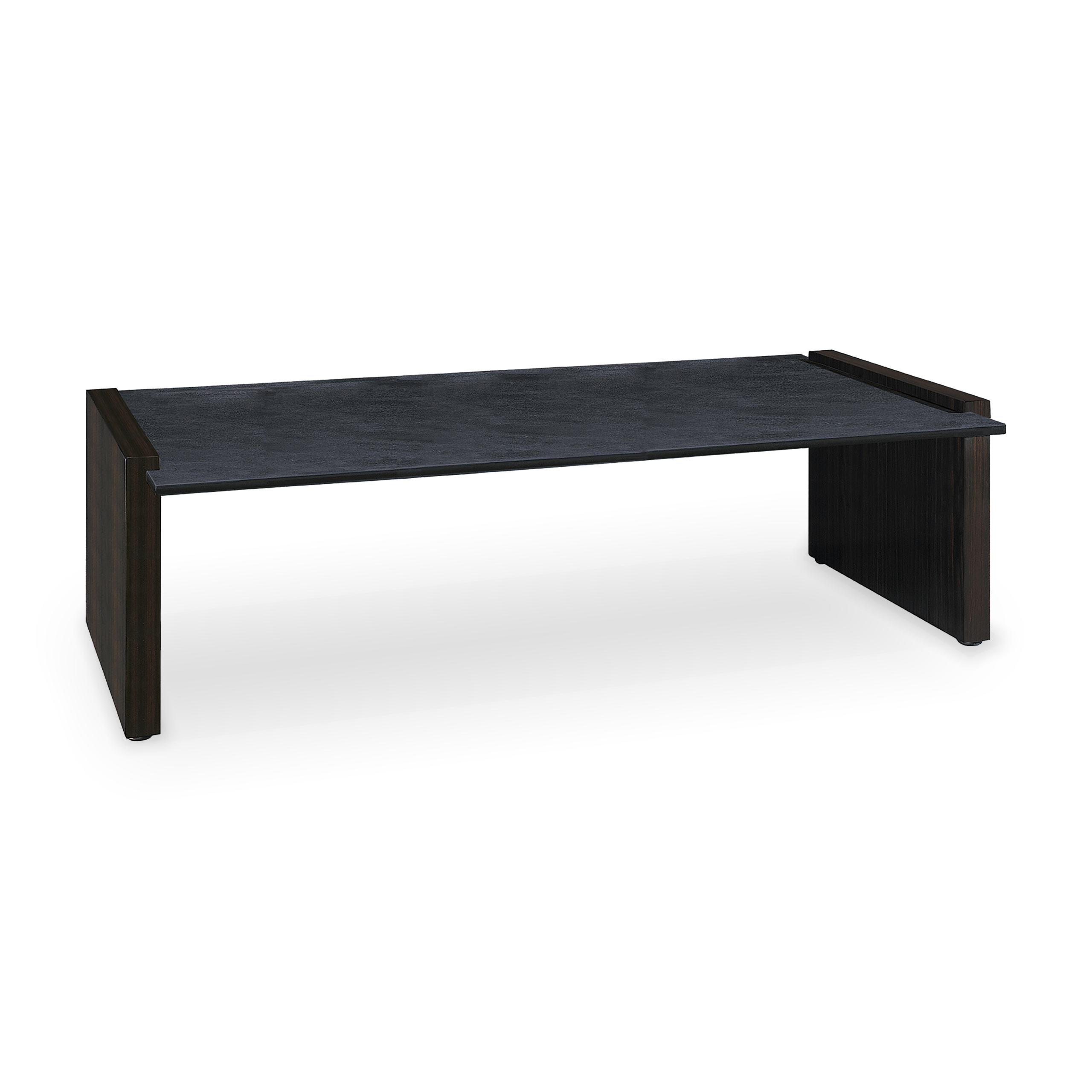 Moderna mesa de centro en forma de grapa con laterales de รฉbano y cubierta de pizarra. A pesar de su sencillez, esta mesa destaca por su refinado diseรฑo, lo que la convierte en una pieza sofisticada.