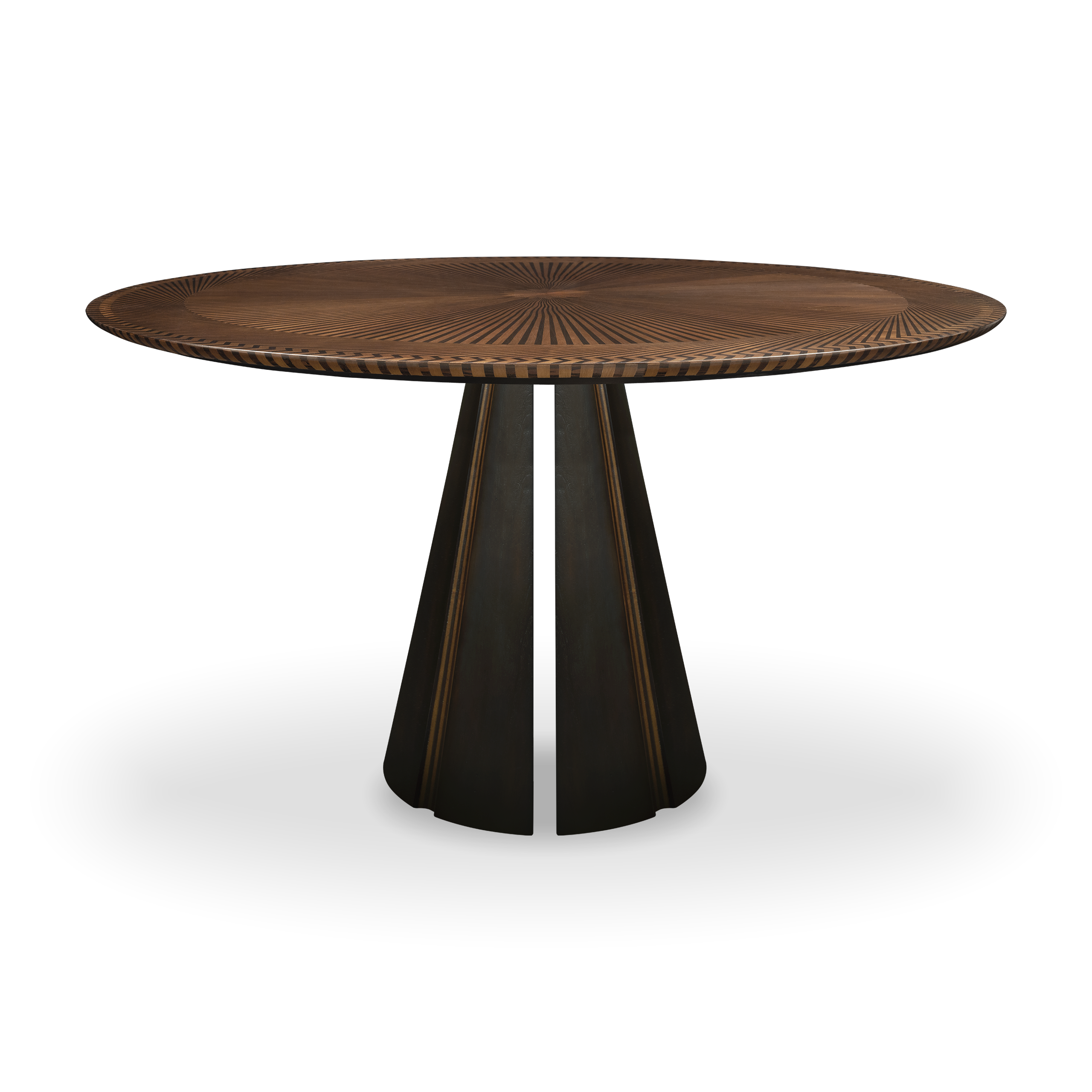 La mesa de comedor Tivoli es una expresión magistral de la marquetería, una técnica ancestral reinterpretada con una visión contemporánea. Su cubierta deslumbra con un diseño radial, donde la combinación de ébano y maple crea un juego de contrastes que captura la mirada y resalta la precisión del trabajo artesanal. El equilibrio entre tradición y modernidad se refleja en su base esculpida, de líneas depuradas y presencia sólida. Su base en acabado ébanizado aporta un aire sofisticado que realza la riqueza visual de la marquetería, logrando una composición armoniosa y atemporal. Una pieza que trasciende su función, la mesa Tivoli encarna el compromiso de Alfonso Marina con la excelencia en la ebanistería, ofreciendo un diseño que enriquece y eleva cualquier espacio.