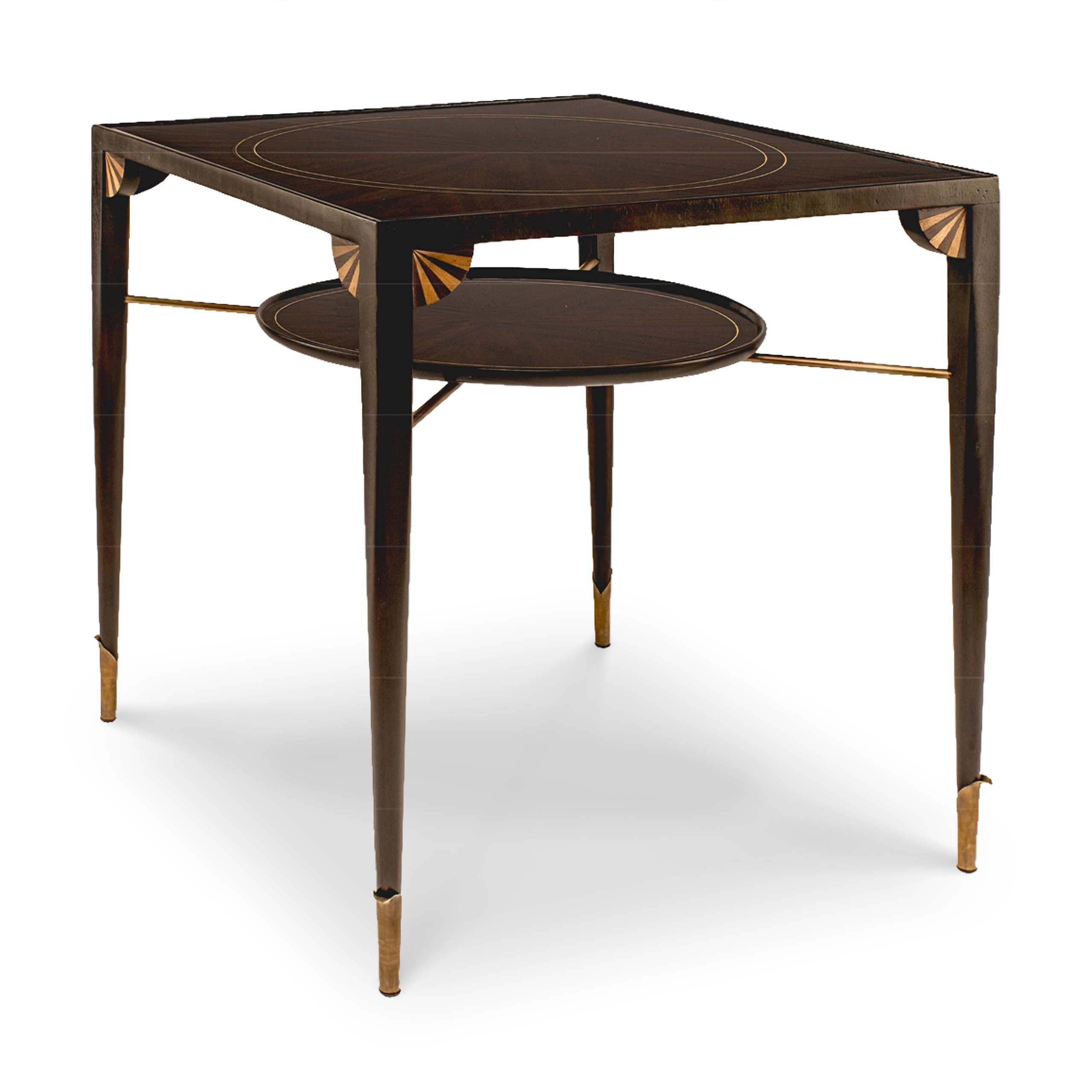 La Mesa Lateral Étoile es una pieza de líneas refinadas, elaborada en madera de ébano, cuya profundidad y elegancia realzan su presencia. El delicado trabajo de marquetería en las esquinas aporta un elegante detalle decorativo que enriquece su diseño. Su estructura esbelta, con patas estilizadas y un entrepaño circular inferior, refleja un equilibrio entre funcionalidad y distinción, convirtiéndola en un acento perfecto para cualquier espacio.