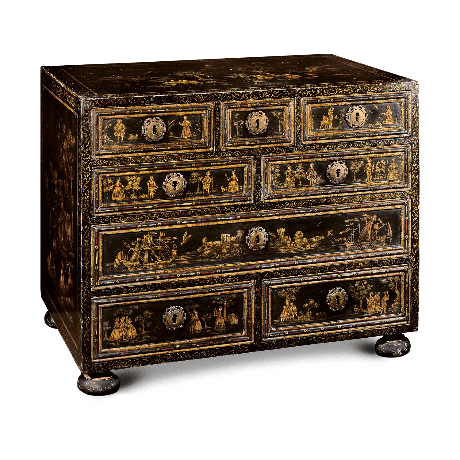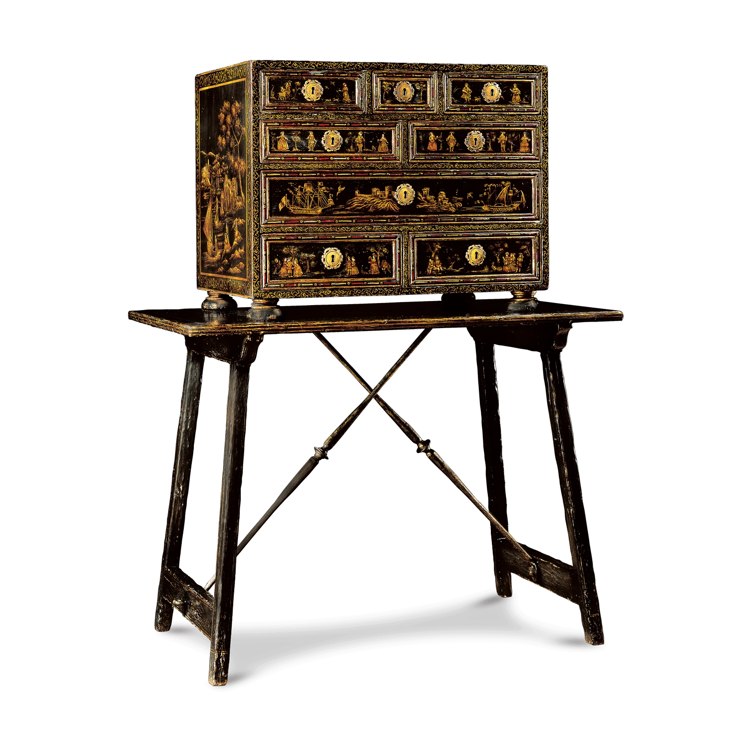 Madera primavera con herraje en latรณn anticado, pintado a mano.