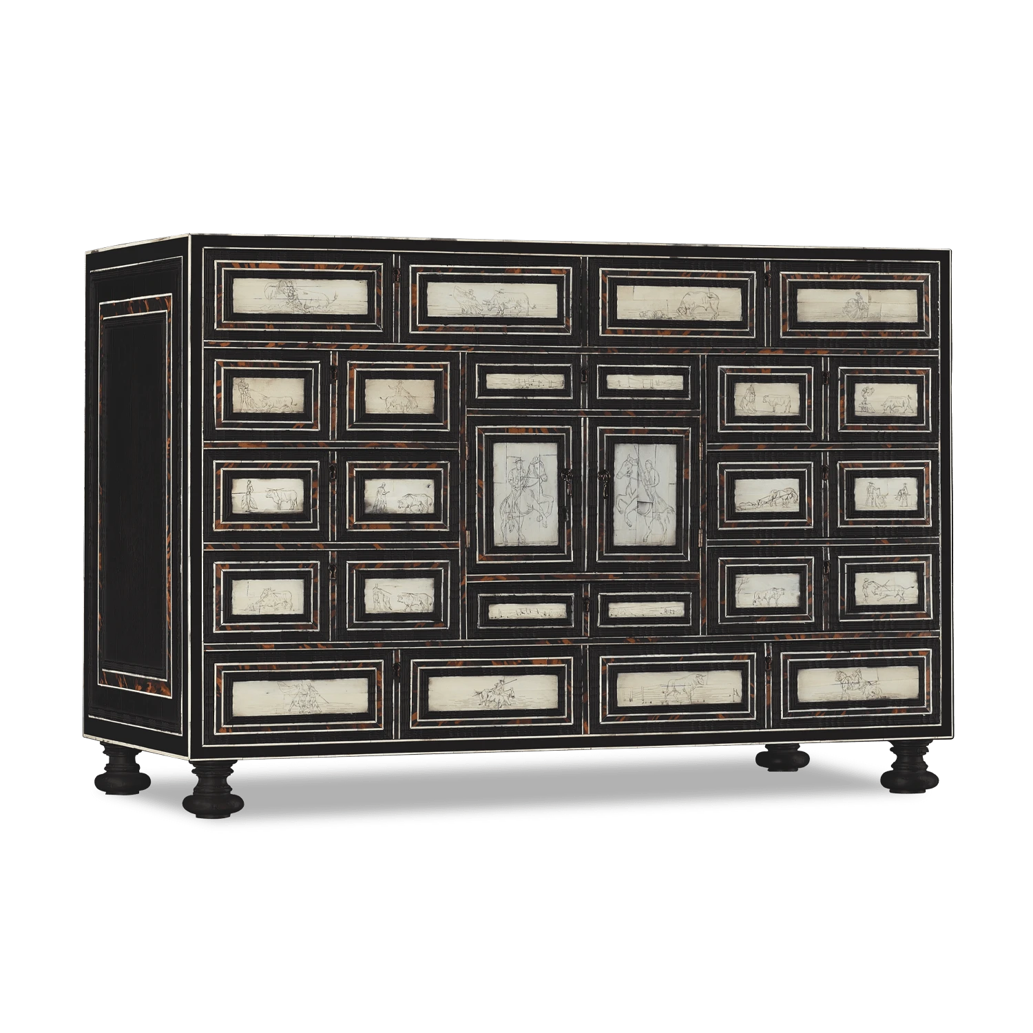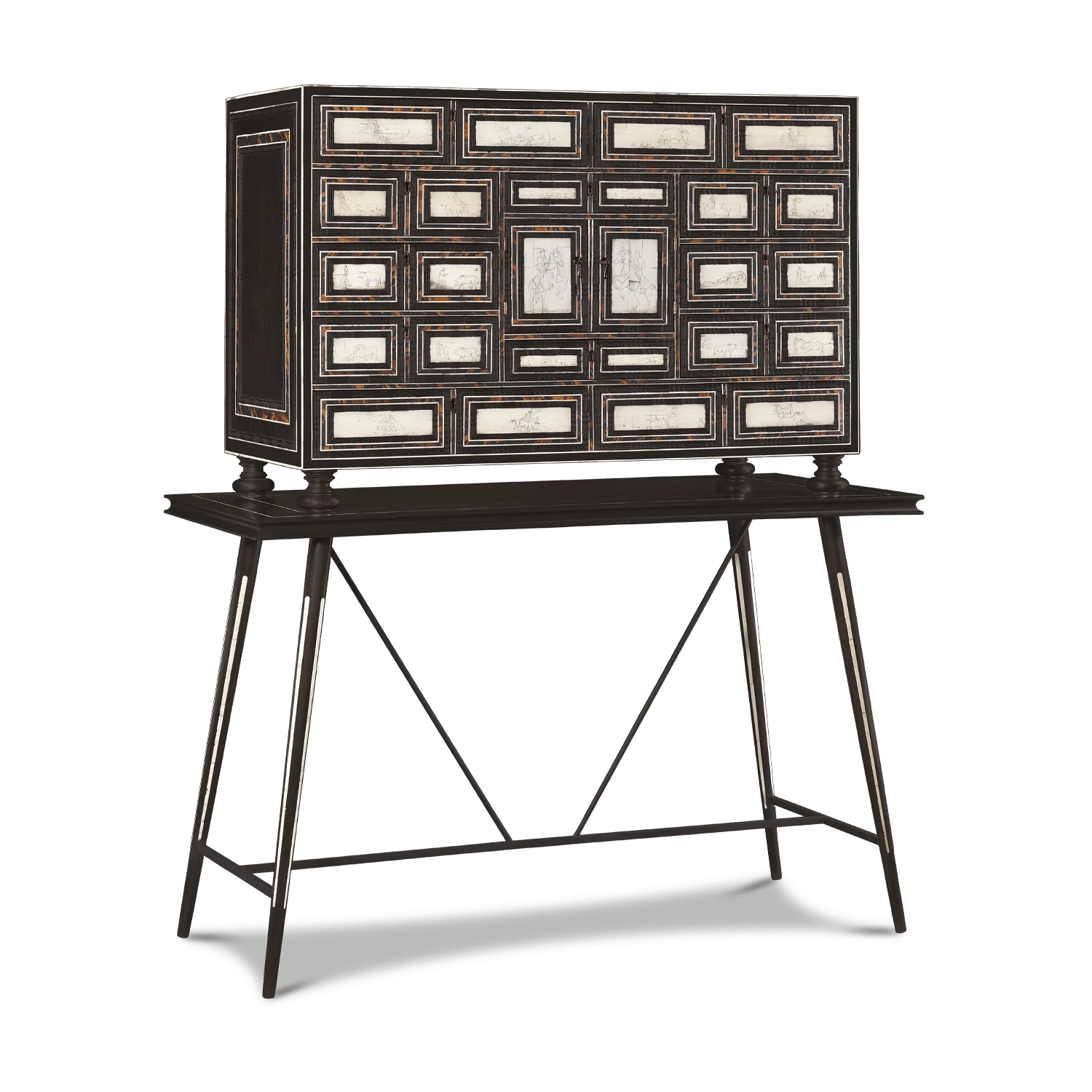 Este impresionante mueble está influenciado por los muebles del siglo XVIII con una base más contemporánea, tiene motivos taurinos esgrafiados y presenta incrustaciones de hueso y carey de imitación.