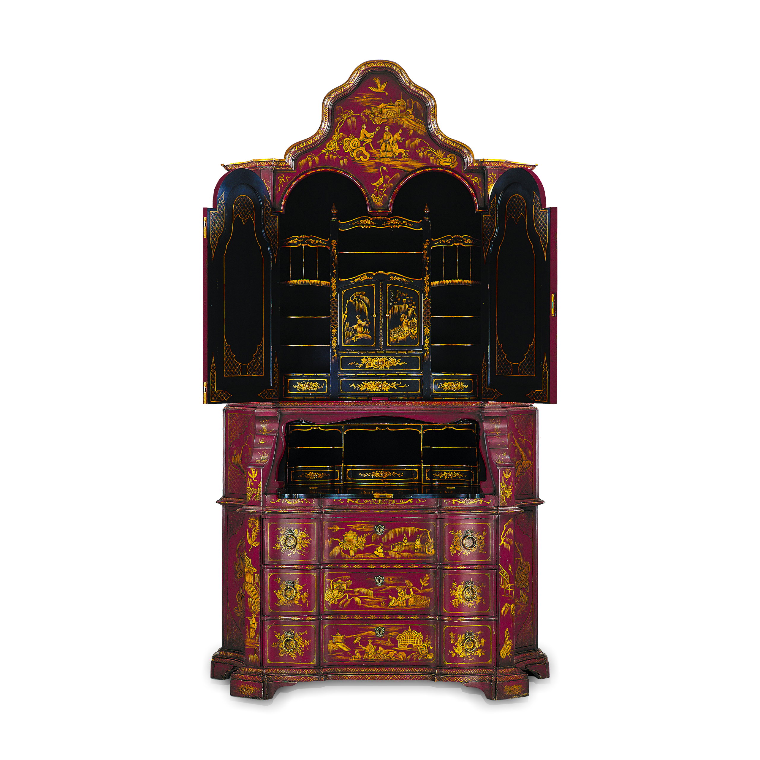 Exquisito Secretaire Italiano Pintado Chinoiserie, inspirado en el Secretaire Italiano del Siglo XVIII. Esta pieza esta pintada a mano en chinoiserie con paisajes y decorados en el frente y en los laterales. Consta de 2 piezas, la pieza superior tiene puertas y al abrirla se encuentra un delicado interior hecho con estantes y pequeรฑas puertas, contrastando con el exterior. La parte inferior tiene un escritorio de hoja abatible que se abre a una superficie para escribir y tambiรฉn tiene estantes y pequeรฑos cajones. Debajo de la hoja desplegable hay 3 cajones con llave. Puede encargar esta pieza en rojo por fuera y negro por dentro o viceversa.