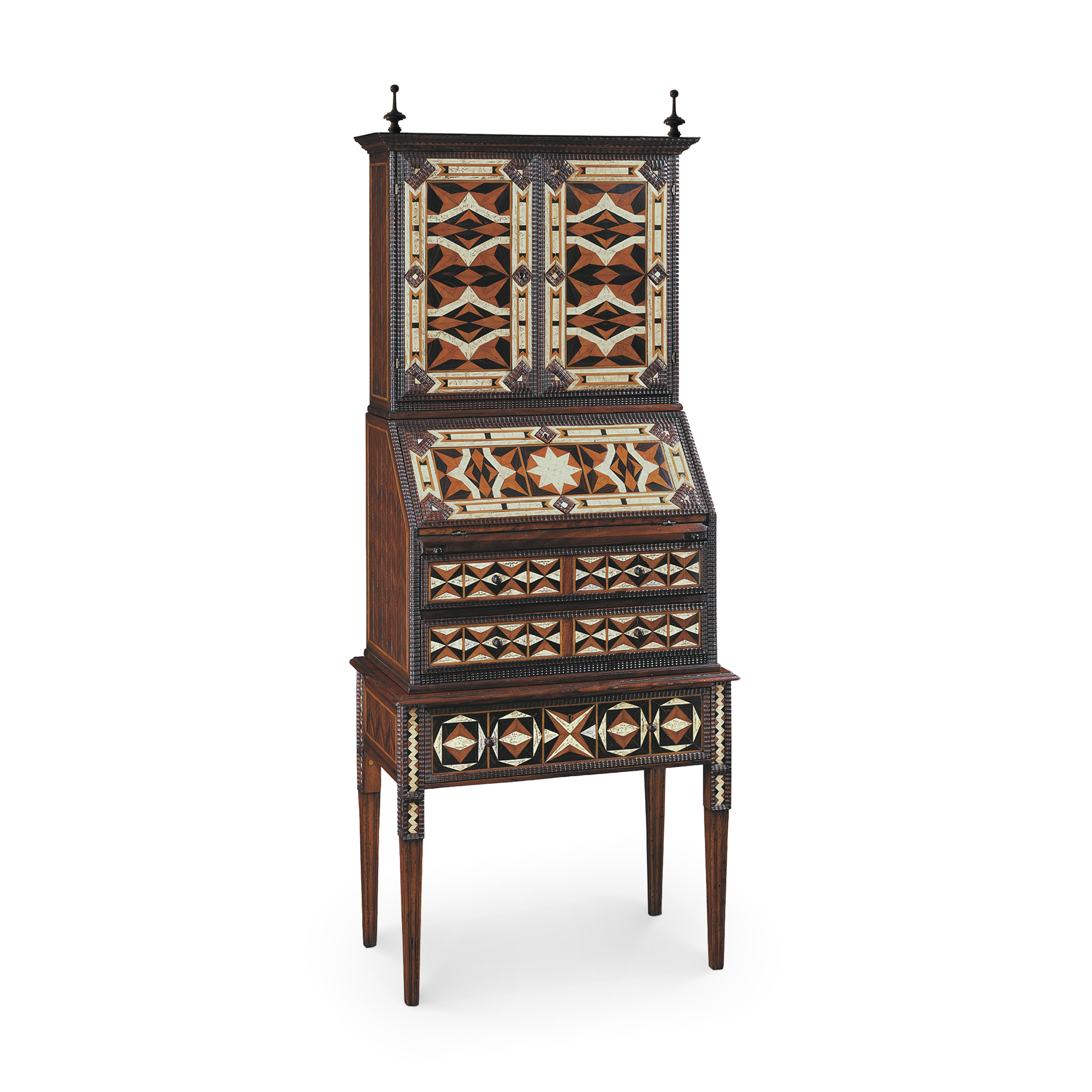 Madera primavera y huanacastle, marquetería con chapa de ébano, granadillo cedro blanco y yew, taracea de hueso esgrafiado y herraje en latón anticado.