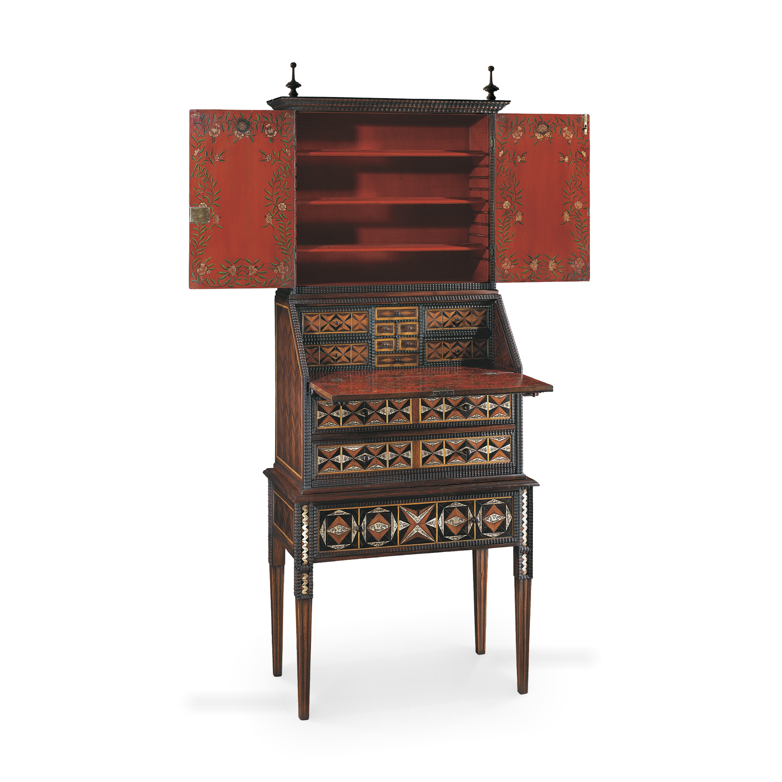 El secretaire Poblano tiene influencias indoportuguesas y del México colonial. La pieza se adapta a las necesidades modernas de los espacios domésticos conservando su esencia original. Su diseño geométrico enchapado llama inmediatamente la atención sobre la pieza que está elaborada con madera, incrustaciones de hueso, ébano y granadillo. En el interior se aprecia un contraste rojo de flores pintadas y pequeños cajones que completan la pieza.