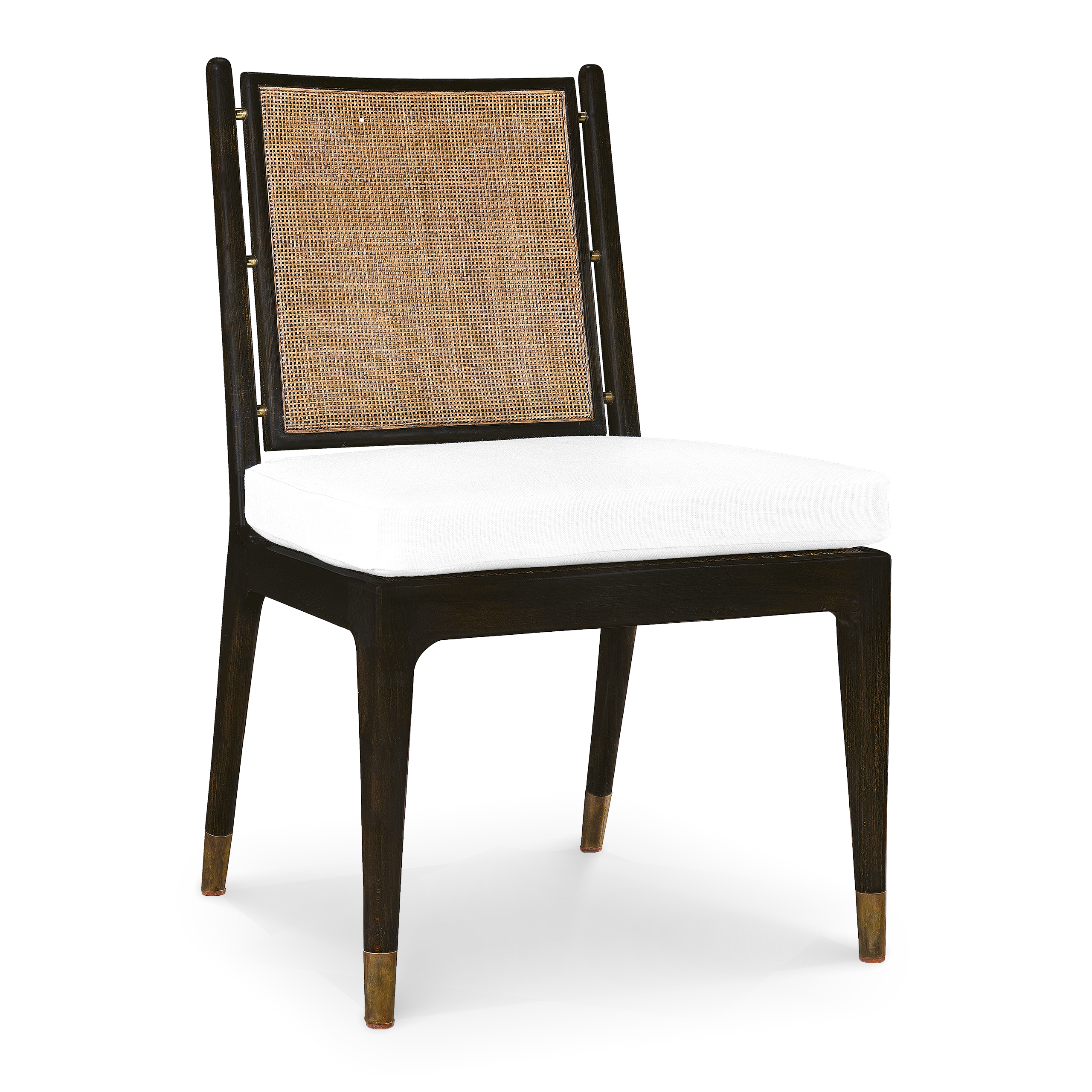 Esta silla de madera se inspira en los diseรฑos europeos de los aรฑos 50. Conformada por un respaldo de bejuco, un cรณmodo cojรญn y separadores de latรณn que resaltan su sofisticaciรณn, es ideal para cualquier entorno de mesa.