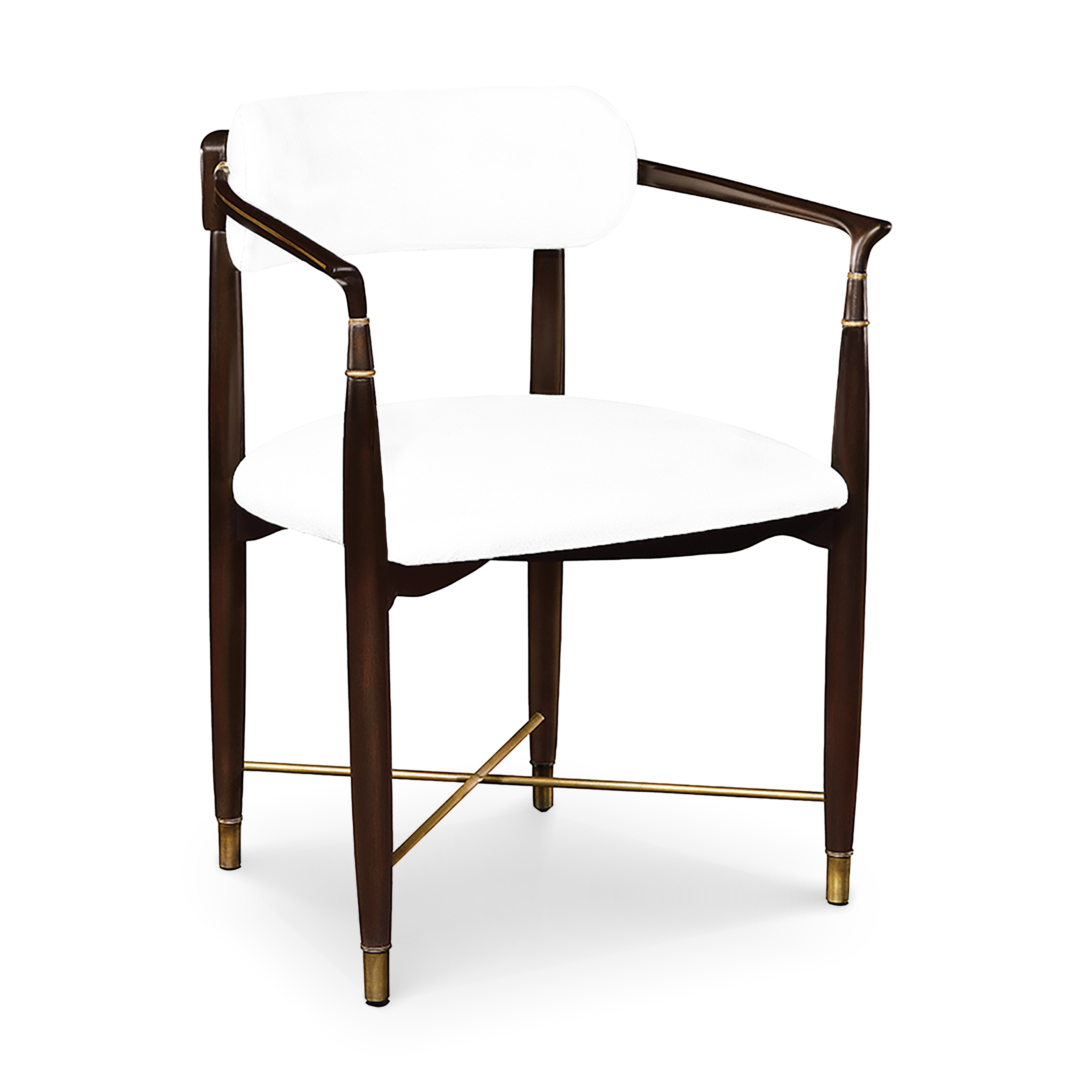 Madera de haya y latón. Asiento con bandastic, tapizado en polyespuma y delcron, respaldo en polyespuma y delcron. Casquillos en latón anticado.