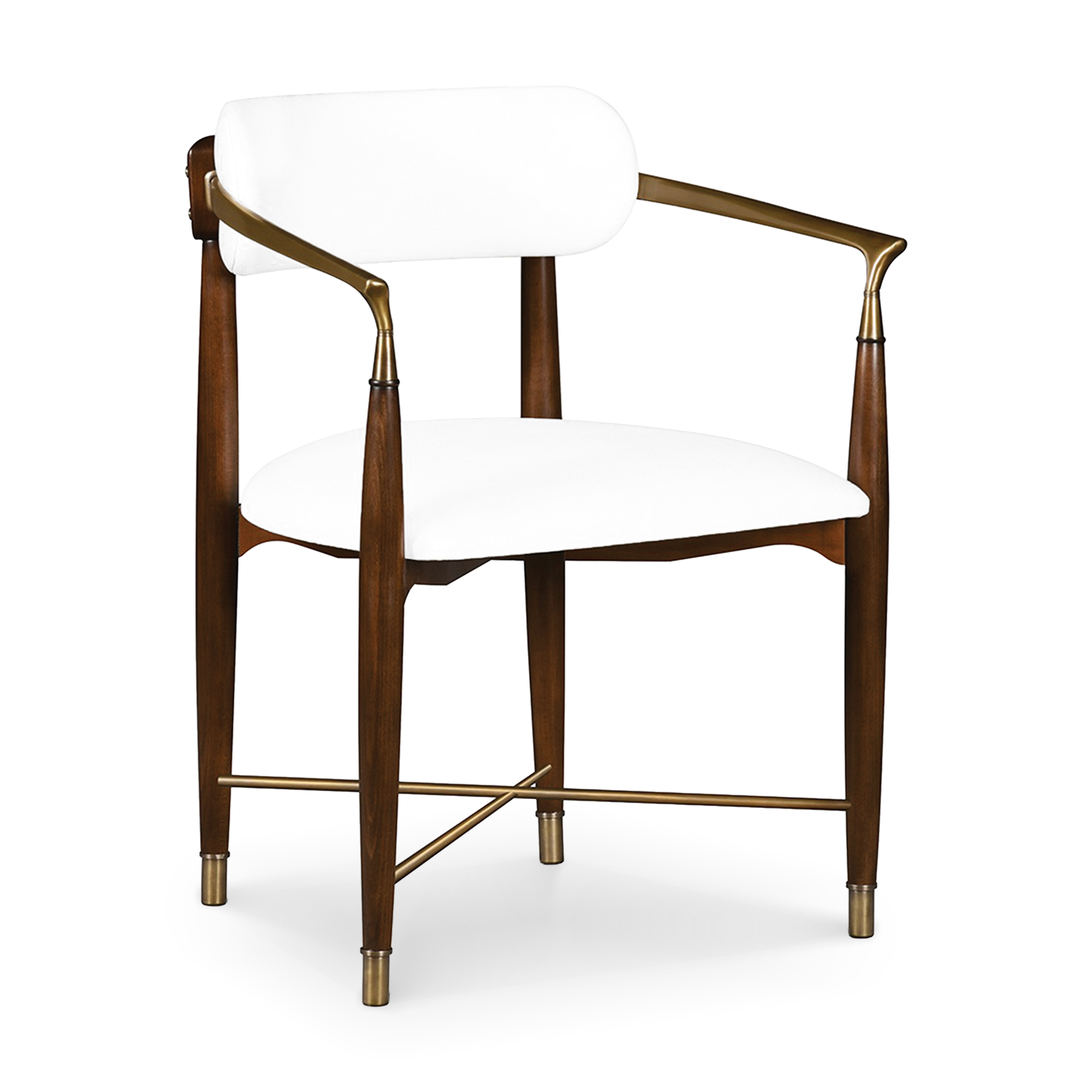 Madera de haya y latón. Asiento con bandastic, tapizado en polyespuma y delcron, respaldo en polyespuma y delcron. Brazos y respaldo de latón. Casquillos y cruceta en latón anticado.