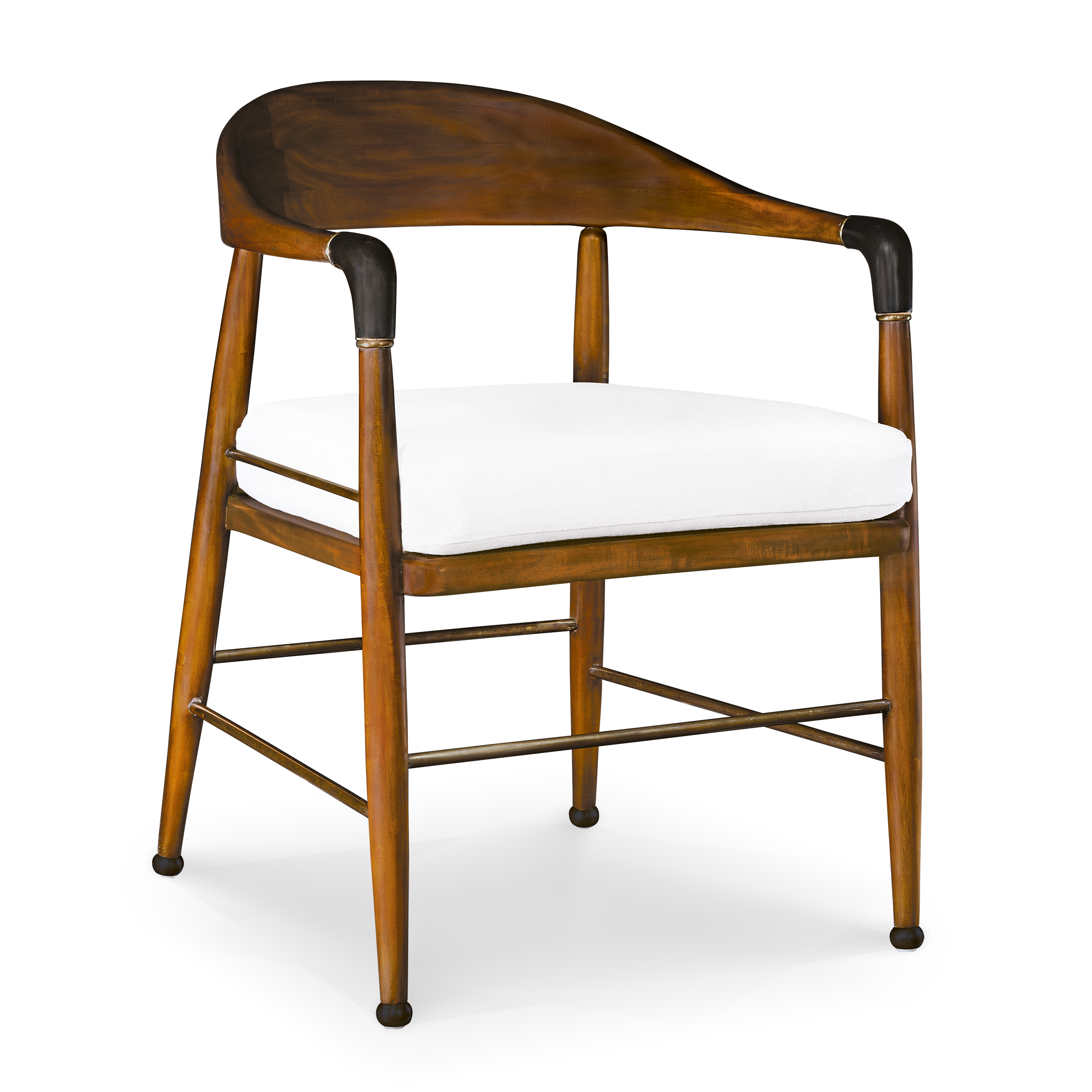 Madera primavera, bejuco en asiento con herraje en latón anticado, tapizado en polyespuma y delcron.
