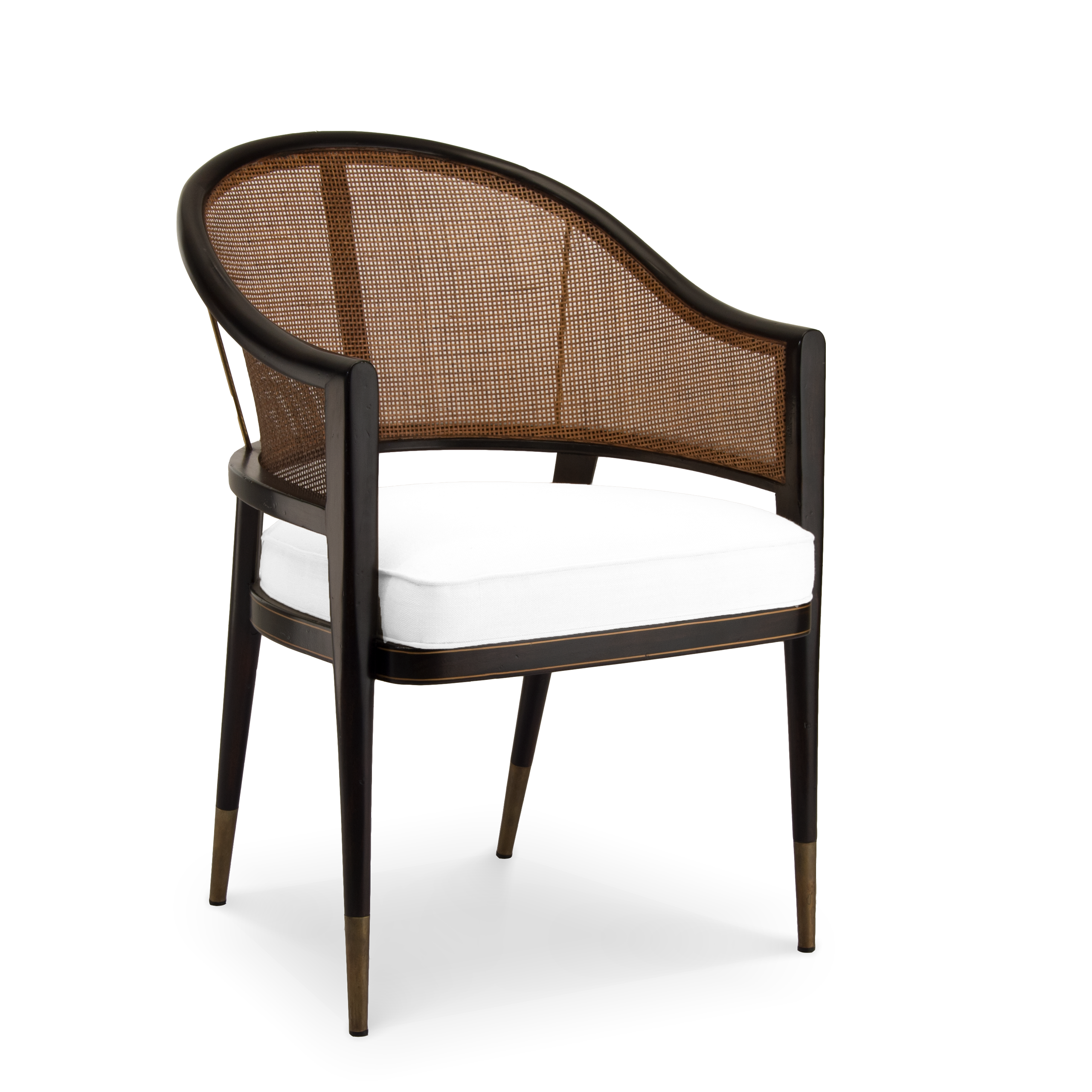 Una sofisticada pieza lograda con el más alto nivel artístico inspirada en Edward Wormley. Esta silla presenta un respaldo redondo con bejuco y delicadas patas con remates de latón envejecido.