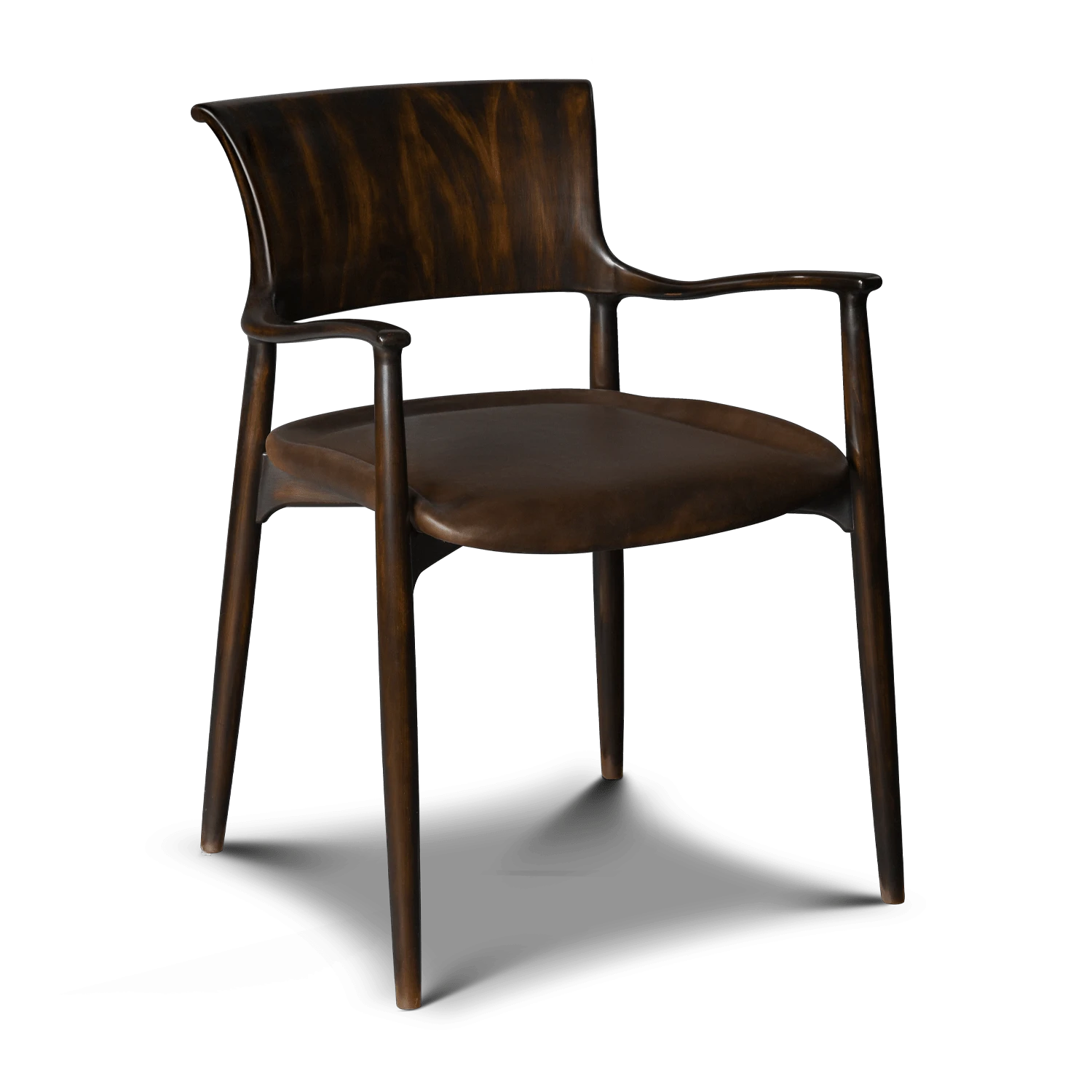 Silla de estilo danés con respaldo moldeado y brazos muy estilizados, tiene un asiento delgado tapizado en piel que le da un aspecto muy desenfadado y moderno.