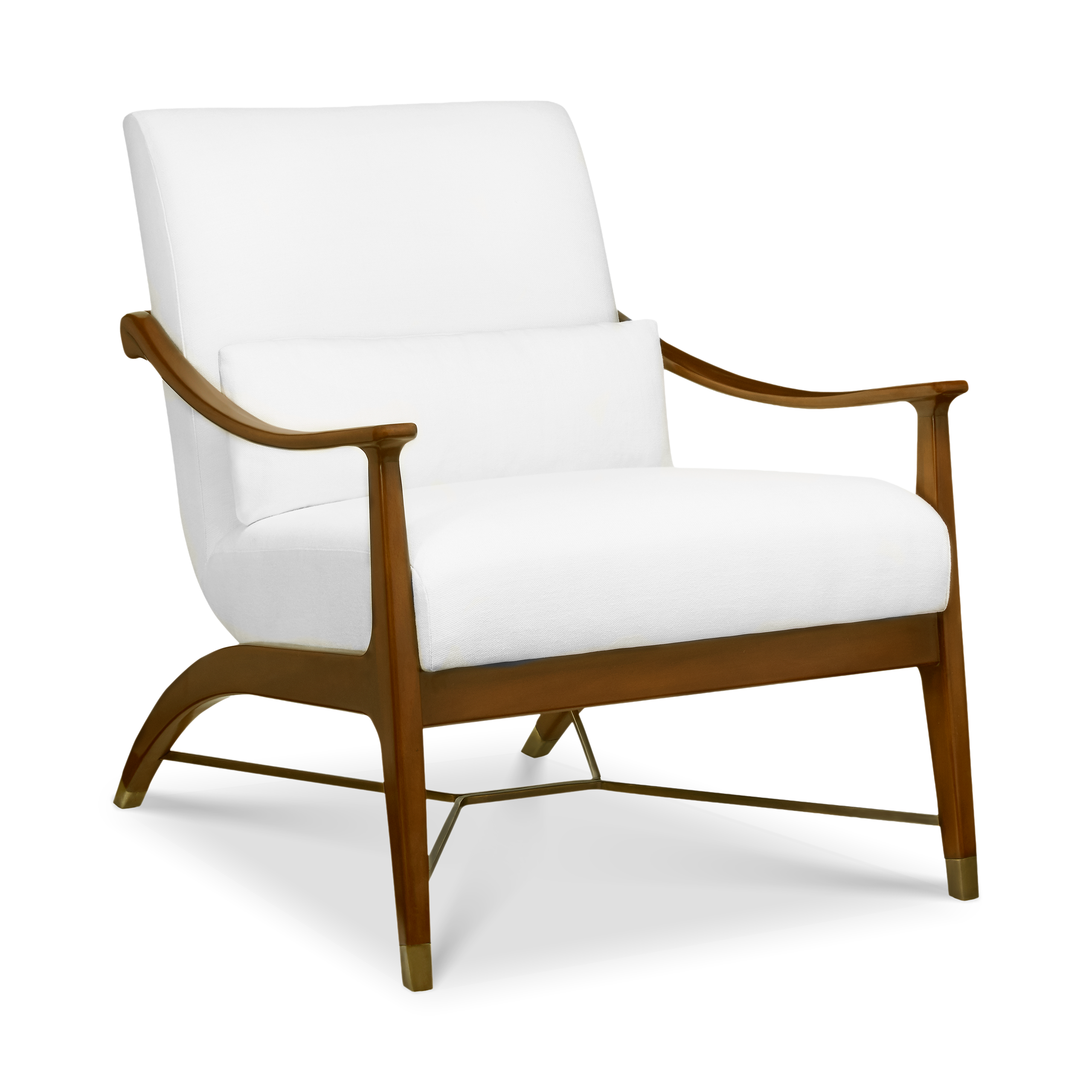 Inspirada en el estilo Mid-Century Modern, con una elegante curva en la pata trasera y un travesaño de latón. Asiento y respaldo tapizados, siguiendo los diseños daneses de la época.